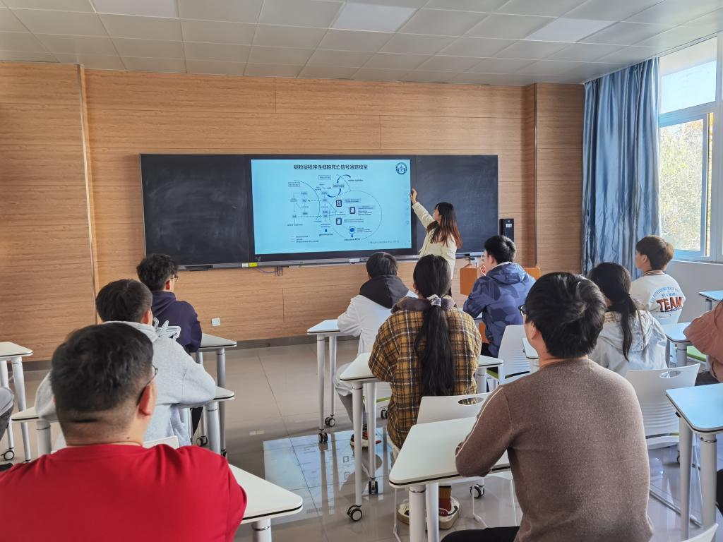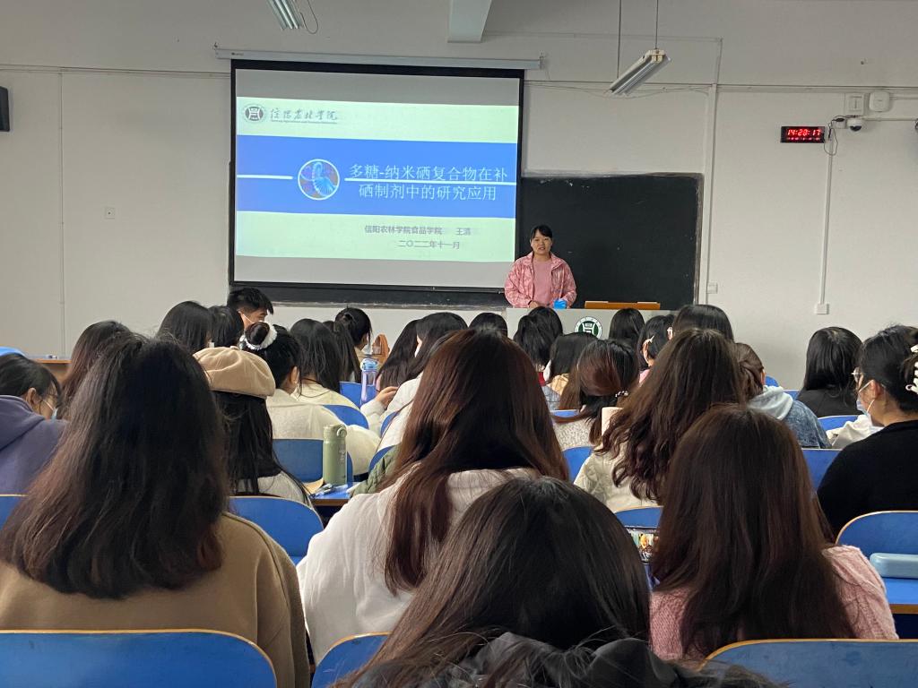 邢淑婕老师以“食品安全之综述”为题,为同学们讲述了食品安全的基本概念,影响食品安全的生物性因素、化学性因素、物理性因素,食品安全监管和保障体系等内容。李坤老师以“林源动物基树脂在食品及功能材料中的应用研究进展”为题,从紫胶及传统的紫胶加工、紫胶的绿色清洁加工体系构建和紫胶及其衍生物在食品及功能材料中的应用三方面为同学们做了报告。王清老师带来题为“多糖-纳米硒复合物在补硒制剂中的研究应用”的报告,郑雪珂老师以“植物生长发育过程中的表观遗传修饰调控”为题,为同学们奉上了一场精彩的报告。
