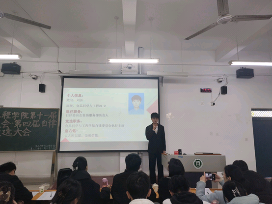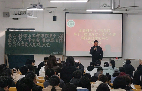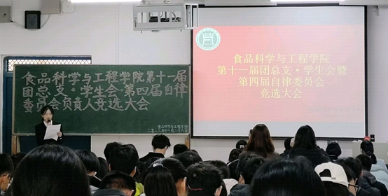 历史诠释光荣,时代赋予使命。为进一步加强学生干部队伍体系建设,推进学院学生工作高质量发展,2023年11月26日下午三点,食品科学与工程学院在二教206教室召开第十一届团总支•学生会暨第四届自律委员会换届竞选大会。学院党总支副书记刘涛、团总支书记易蕾、专职组织员王子伟及学工组老师出席了本次会议。参加此次大会的还有第十届食品科学与工程学院团总支学生会暨第三届自律委学生干部以及50位竞选候选人等。
