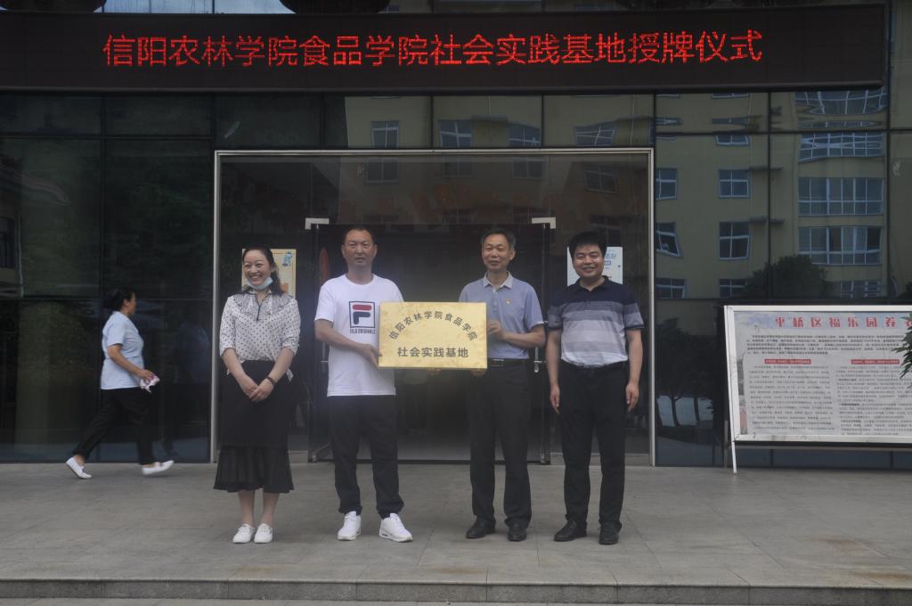 为了弘扬尊老爱老、敬老助老的民族传统美德,提高新时代大学生社会实践能力,增强当代大学生社会责任感,7月15日,beat365在线平台官网食品学院携手平桥区社会福利中心举行“beat365在线平台官网食品学院社会实践基地”挂牌仪式。在食品学院党总支书记夏新奎、党总支副书记刘涛、团总支书记易蕾、组织员王子伟、专职辅导员黄卉卉和柳诚刚、陈龙老师的带领下,食品学院师生们走进信阳市平桥区社会福利中心开展2021暑期社会实践活动。