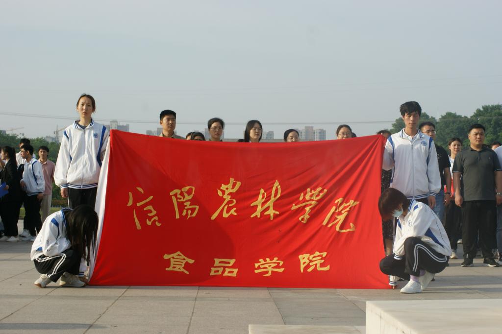 为庆祝中国共产党成立100周年,回顾中国共产党团结和带领全国各族人民不懈奋斗的光辉历程,深入开展党史学习教育,持续激发学生爱党爱国爱社会主义的热情,引导大学生厚植爱国主义情怀,感悟革命精神,追寻先辈足迹,抒发爱党之情,感党恩、听党话、跟党走,5月10日早上,食品学院在汝宁广场举行“赓续红色百年,唱响青春旋律”为主题的升旗仪式,食品学院党总支书记夏新奎、食品学院党总支副书记刘涛、食品学院团总支书记易蕾、食品学院组织员王子伟、全体辅导员老师及全体学生参加此次升旗仪式。