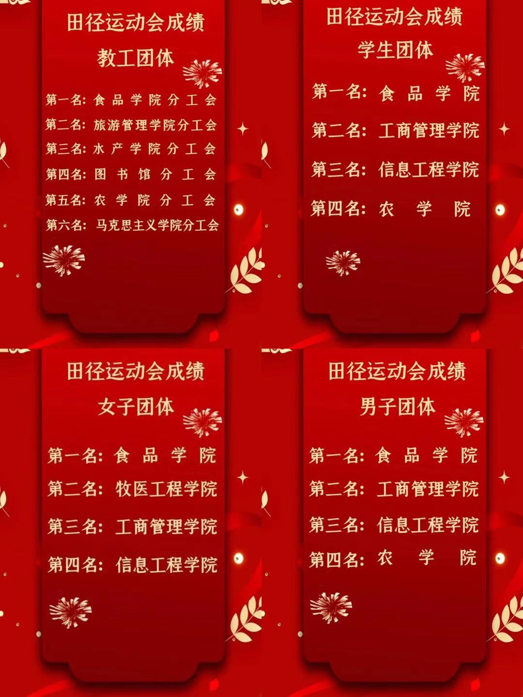 校田径运动会作为学校最大型的体育活动,已经成为一个育人新平台。运动会上食品学院全体师生顽强拼搏、团结协作,展现出了食品学院全体师生全员上阵的集体精神、自我施压的拼搏精神、上下一心的团队精神、以老带新的传承精神和初生牛犊的无畏精神。全体师生将以更饱满的热情、昂扬的姿态和拼搏的精神创造学院更加美好的明天,为学校顺利通过本科教学合格评估贡献力量,以优异成绩向建党一百周年献礼!