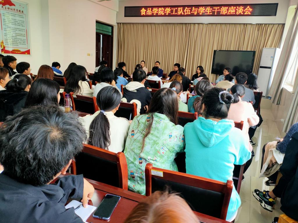 为进一步提高学生干部的综合素质,增强大局观念,提升服务意识,增强学生干部的凝聚力与战斗力,2021年4月6日,食品学院在1B206召开了学工队伍与学生干部座谈会。食品学院党总支副书记刘涛、团总支书记易蕾、组织员王子伟、专职辅导员黄卉卉和柳诚刚出席了本次会议。会议由刘涛老师主持,全体学生干部参加。
