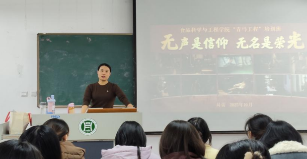 为在红色叙事中感悟奉献精神、筑牢理想信念根基,食品科学与工程学院于10月在二教107开展“青马工程”主题培训。活动以“无声是信仰 无名是荣光”为主题,由易蕾老师主讲,众多学生代表积极参与。