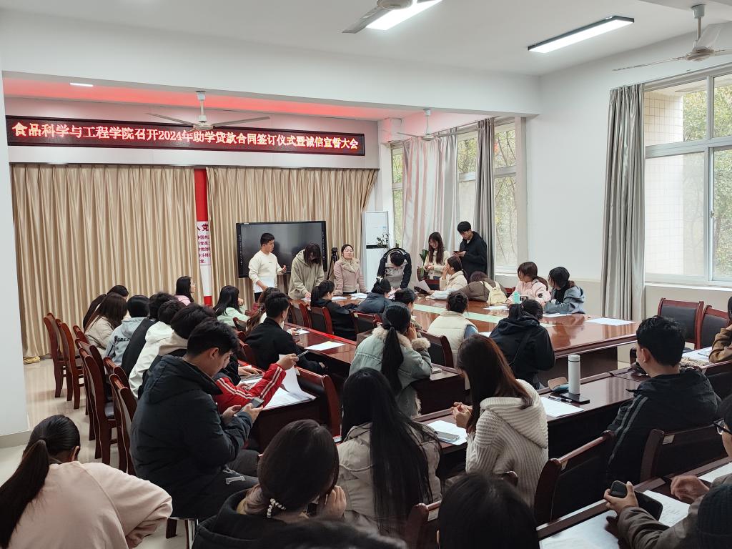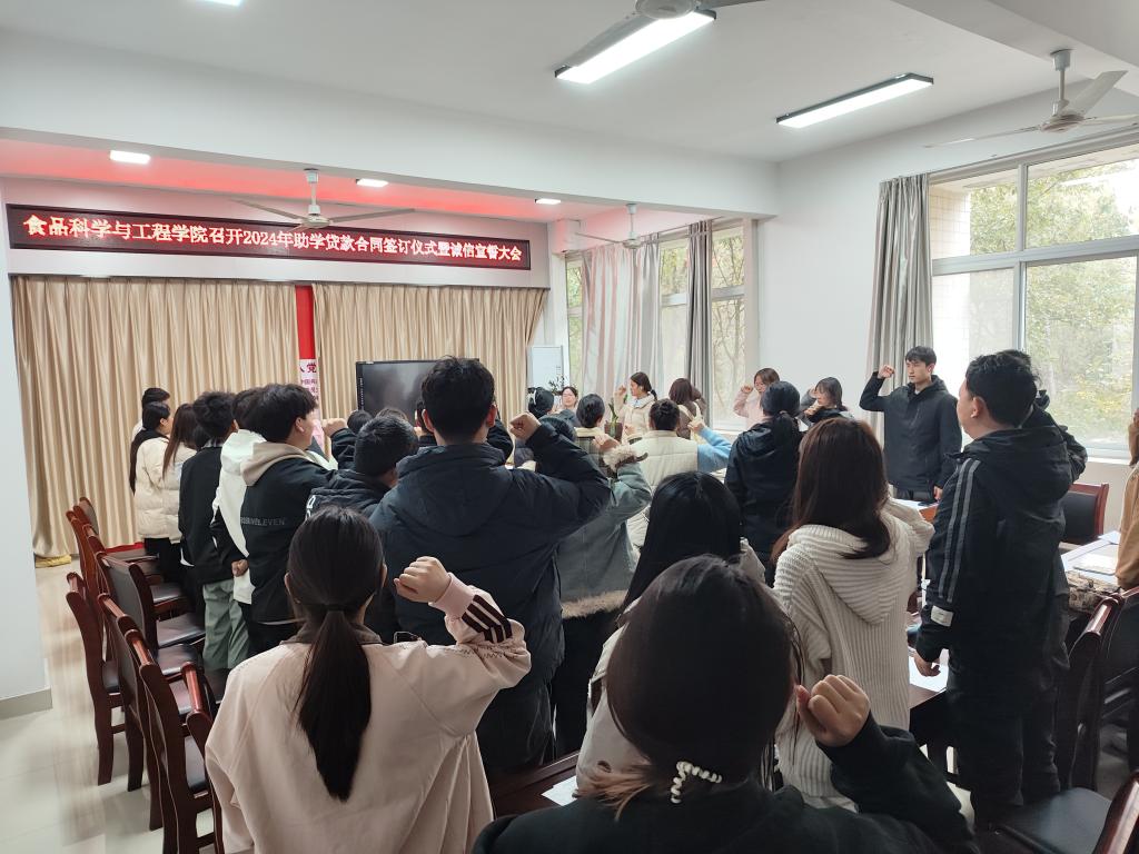 为了进一步做好2024年国家助学贷款工作,提高学生诚信意识。11月20日中午,食品科学与工程学院在1B206教室举行了2024年度国家助学贷款合同签订仪式暨诚信宣誓仪式,学院资助专员杨婷老师、学院资助部成员以及申请2024年度国家助学贷款的同学参加了此次大会。