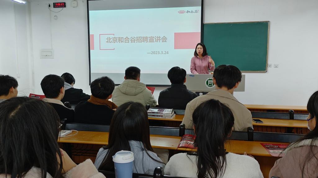 为更好地拓宽2023届毕业生就业渠道,促进毕业生更加充分更高质量就业,3月24日晚上19点,食品学院邀请北京和合谷餐饮服务有限公司在二教103举行专场招聘宣讲会,我院2023届毕业生积极参加。