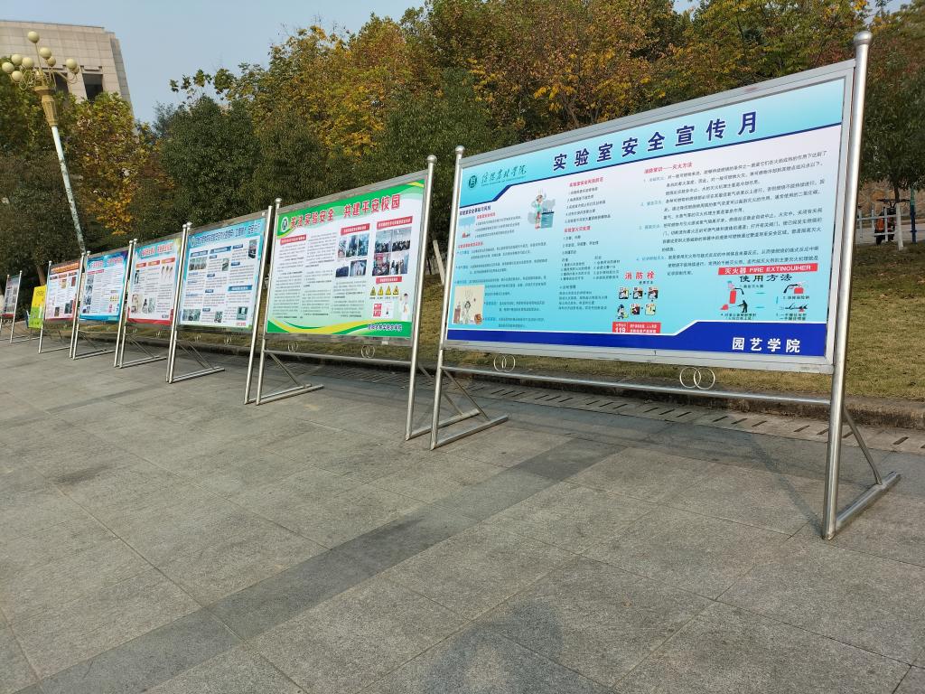 在全校范围内通过展板集中展示危险化学品安全、有毒有害废弃物安全、特种设备及一般设备安全、辐射安全知识、生物安全、消防安全、水电安全等实验室安全管理知识规范及发生的各类实验安全事故如化学品类、火灾爆炸类、水电类的应急处理措施及急救常识。进一步树牢安全发展理念,全力筑牢校园安全防线和底线红线,为“平安校园”保驾护航。