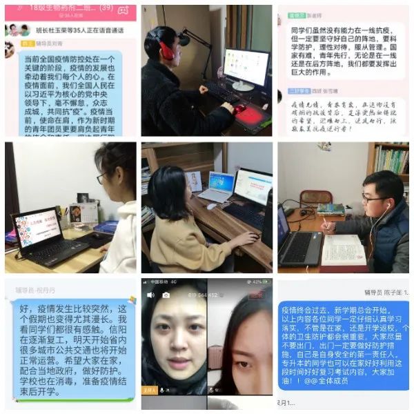 各位辅导员老师积极参与所在班级团支部的团课学习活动,对同学们的发言进行点评。同时传达了近期学校关于延迟返校的有关要求和疫情防控的相知识,并就同学们关心的问题进行了耐心细致的解答,帮助同学们缓解焦虑情绪、引导同学们要按照学校“停课不停学”的要求坚持做好线上学习。