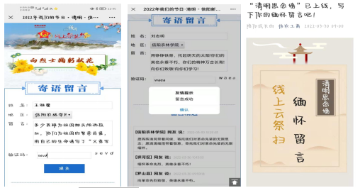 利用学院微信公众号“信农工商”宣传清明节民俗文化,引导全院学生通过“信阳文明网”、“文明信阳”微信公众号等平台开展网上祭英烈活动,同学们积极寄语、鞠躬献花,以文明、环保、健康、安全的祭扫方式表达对英烈的缅怀,传承红色基因,提高文明素养,自觉倡树时代新风。