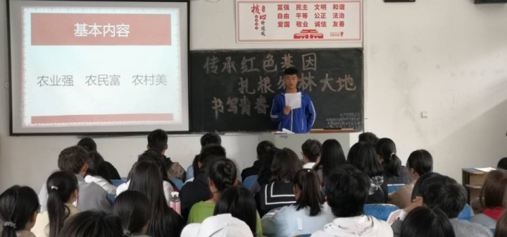 活动从11月15日伊始,首先以介绍中国农业的发展历程为主,其中介绍了世界杂交水稻之父——袁隆平,介绍袁隆平老人对人类的贡献以及他的影响;介绍了习近平总书记提出的“三农观”以及三农观的基本内容;介绍三大精神——焦裕禄精神、红旗渠精神、愚公移山精神,以及对三大精神的深刻理解、如何弘扬三大精神;介绍大别山精神及其内涵和大别山精神的重要意义。其次以观看相关视频的形式,使同学们对红色文化的传承意义和重要作用有了深刻的了解。最后学生代表做了总结演讲,在集体合唱团歌中结束了此次活动。