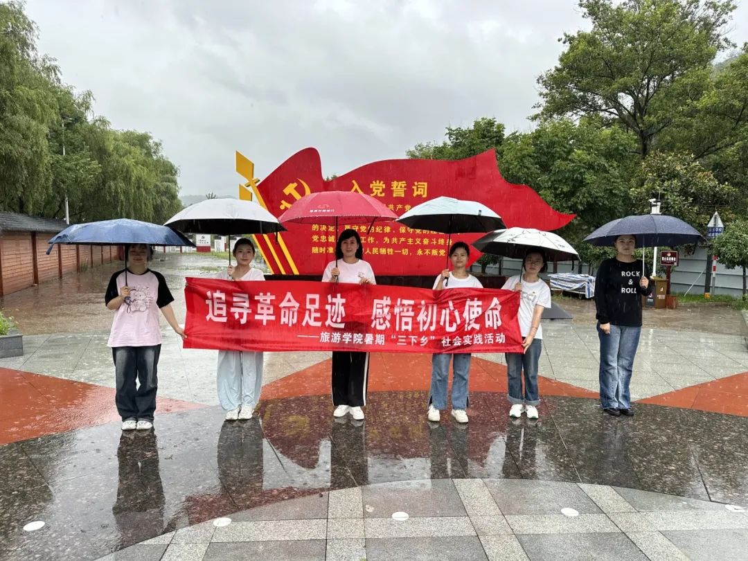 当天早晨,师生们先是到达了何家冲红色广场,在广场上面对党旗重温了入党誓词,并在雨中合影留念。