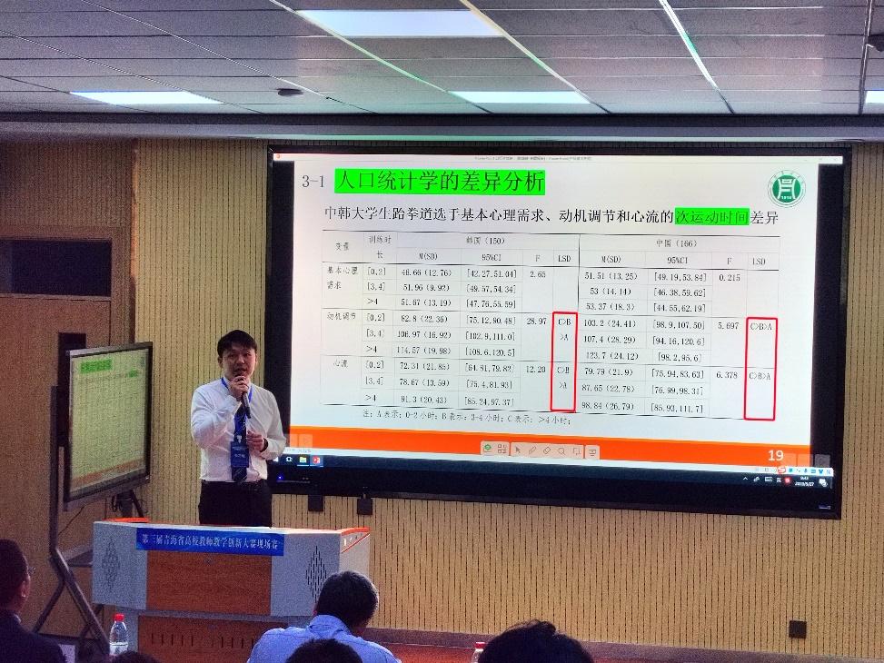 韩坤键老师的论文《中韩大学生跆拳道运动员基本心理需求、动机调节与心流的关系研究》被大会收录并作分会场专题报告。在“学校竞技运动与学生心理”专题会场,韩坤键老师从投稿论文的研究背景、研究方法、研究结果、讨论、结论与建议五个方面进行了阐述,并与参会专家、学者就“运动员心理技能训练”的理论与实践问题进行了探讨和交流。