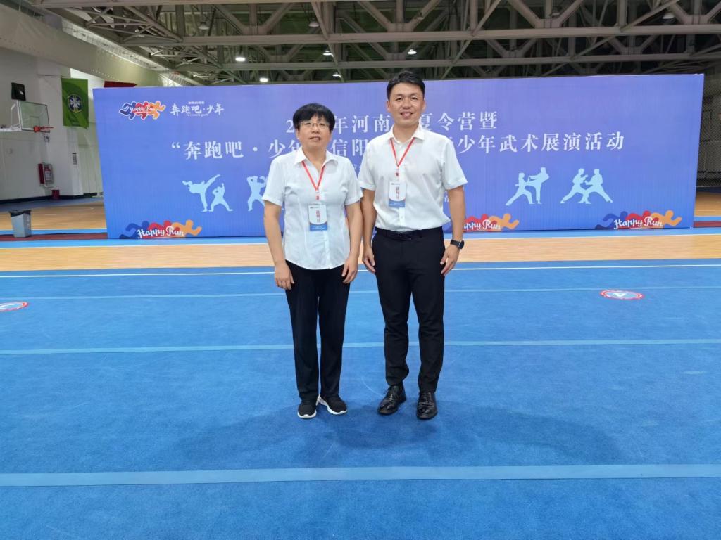 7月26-28日,2023年河南省夏令营暨“奔跑吧·少年”信阳市儿童青少年武术展演活动在信阳市羊山新区百花会展中心正式拉开帷幕。本次赛事由河南省体育局青少年体育处指导,信阳市教育体育局主办,羊山新区教育体育局承办。参赛单位为各县区教育体育局(体育中心)、武术传统项目学校等,我院教师韩智、韩坤键应邀参加比赛执裁工作。