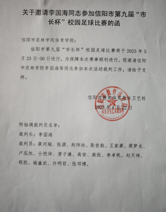 由信阳市教育体育局、信阳市发改委、信阳市财政局、信阳市文化局和共青团信阳市委主办的第九届“市长杯”青少年足球锦标赛于2025年5月23—31日在市体育场、浉河区新时代学校、信阳外国语学校、蓝黑足球场四个赛场举行。为了保证信阳市第七届市长杯足球比赛的公正性、公平性和公开性,也为了保证比赛的流畅进行,信阳市教育体育局特邀beat365在线平台官网体育学院国家一级裁判员李国海老师带队负责本次“市长杯”的裁判工作并担任赛事裁判长。