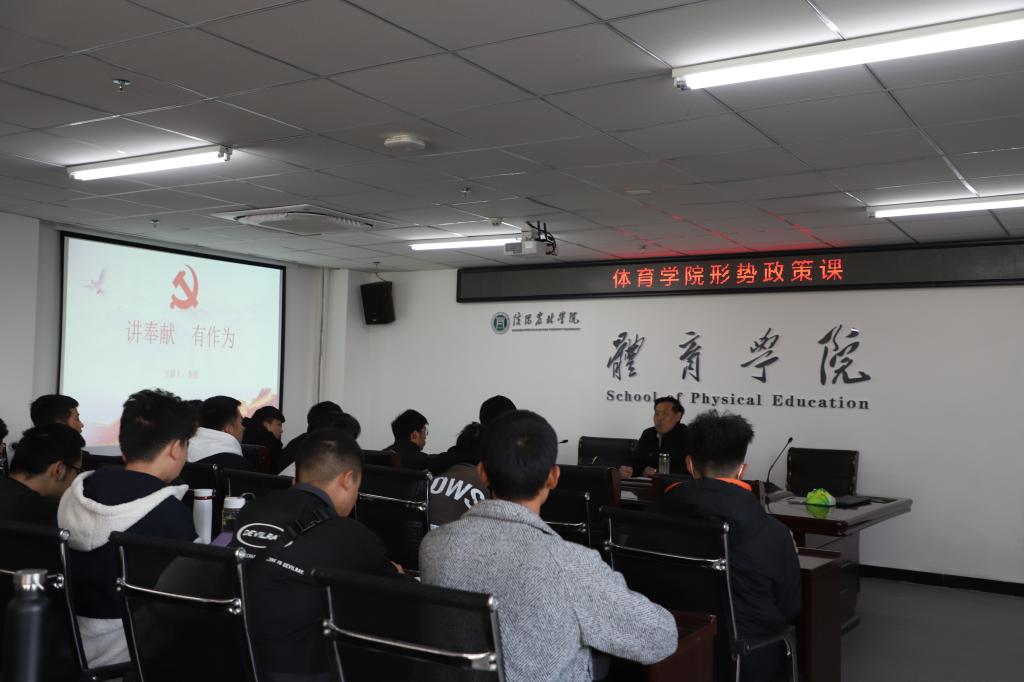 为坚定学生理想信念,把握好思想总开关,树立正确的世界观、人生观、价值观。11月18日,体育学院院长李俊在学院会议室讲授《有奉献 讲作为》形势与政策课,休闲体育专业2020级全体学生参加。