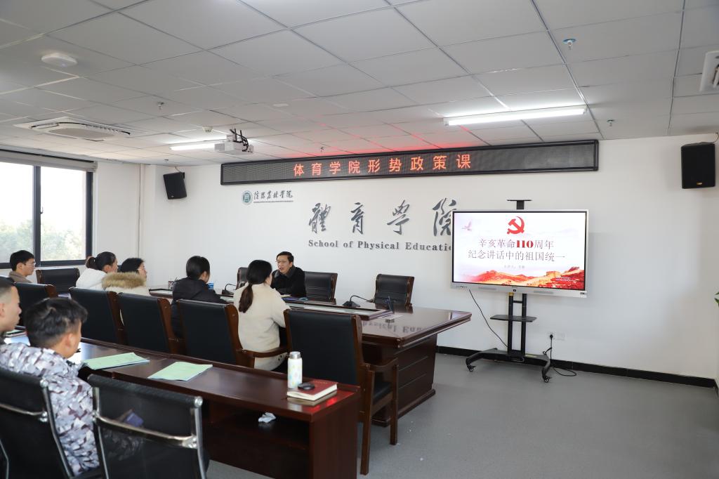 12月27日,体育学院党总支书记李耕以“辛亥革命110周年纪念讲话中的祖国统一”为题,为2019级休闲体育专业全体学生讲授形势与政治课。