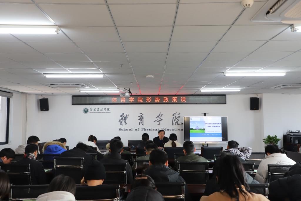 12月28日,体育学院院长李俊在学院会议室讲授题为“学习贯彻习近平总书记关于创新的重要论述”的形势与政治课,休闲体育专业2019级全体学生参加。