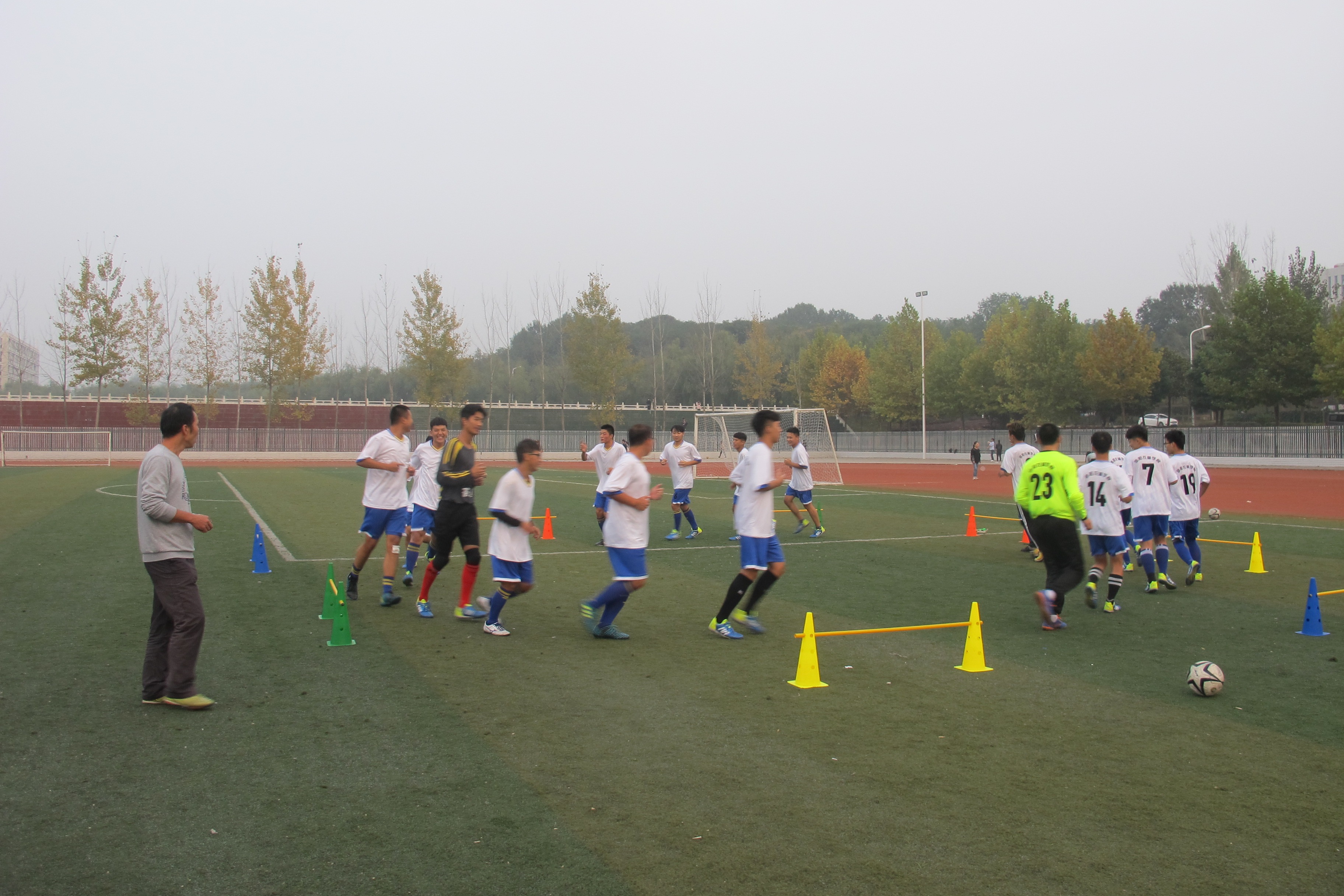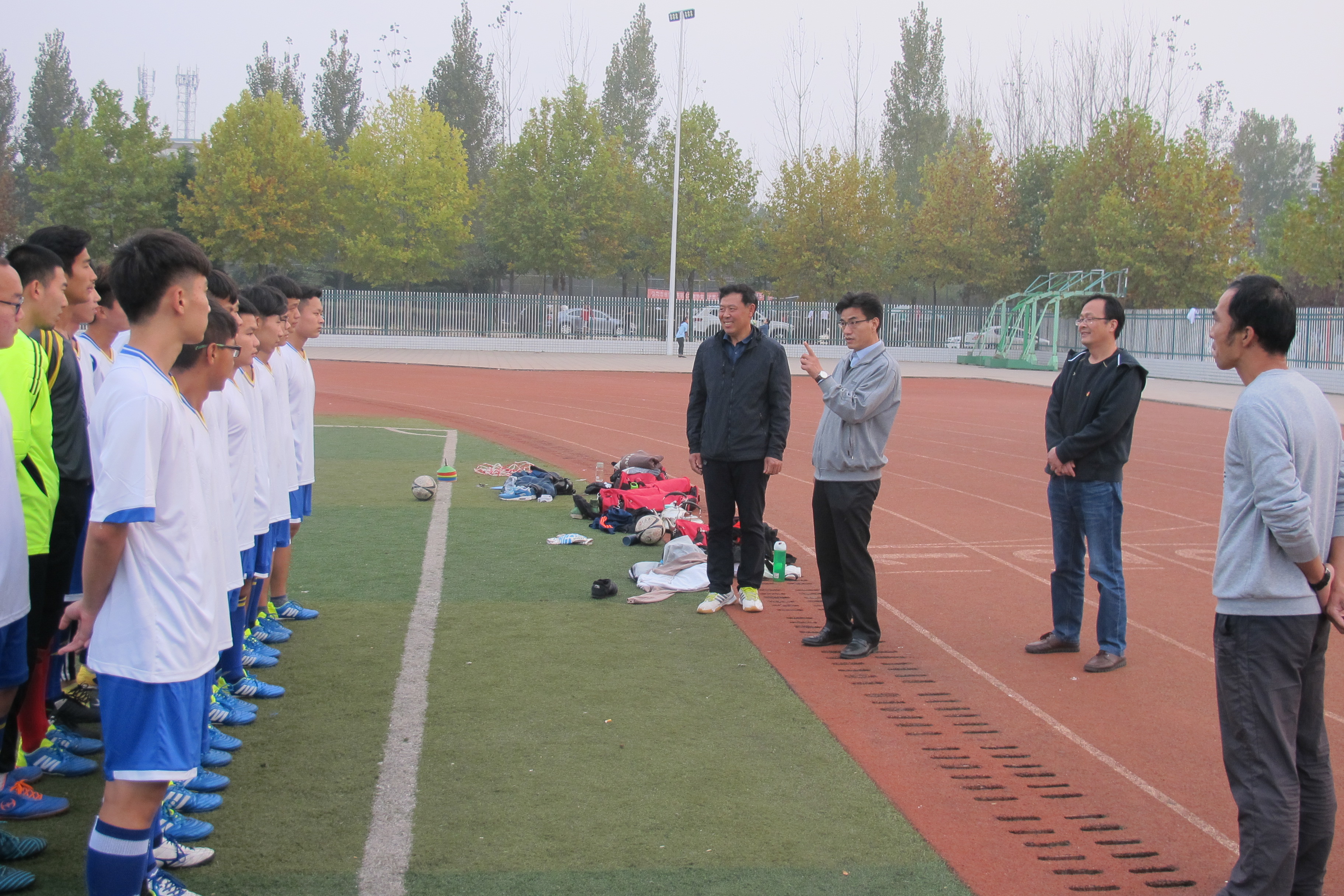 10月23日下午,副校长赵一鹏、学生处处长何涛来到beat365在线平台官网足球场,看望积极备战河南省大学生“华光”体育活动第十六届足球锦标赛的beat365在线平台官网学生男子足球队,并为他们加油鼓劲。