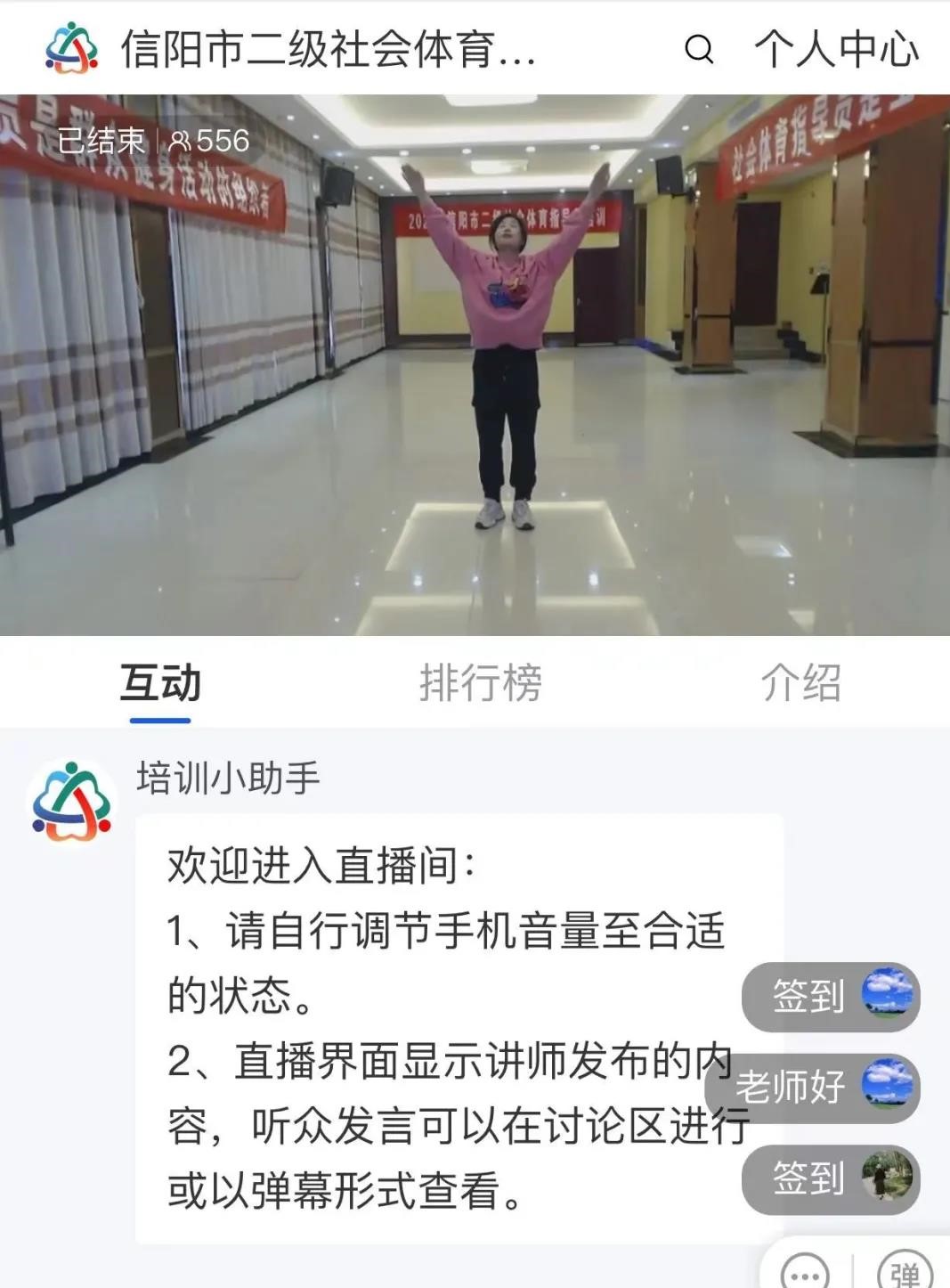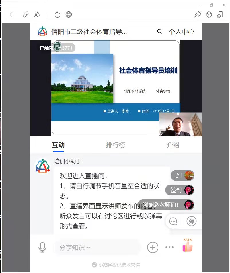 本次培训采用线上直播的形式,共有3700多人参加,培训重理论教学和技能实践相结合。我院院长李俊承担了社会体育指导概论理论教学,从社会体育指导员制度历史演变、社会体育指导员的地位与作用、社会体育指导员的能力素质以及社会体育指导员发展趋势等方面详细阐述了社会体育指导的价值和意义。副教授郭晓芳承担了广播体操实践部分的教学,郭老师耐心讲解,准确示范,积极带动学员练习,获得学员一致好评。