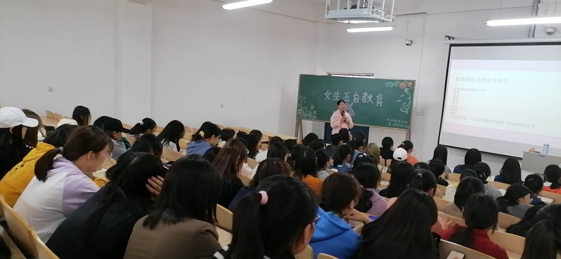 为进一步加强女生自我保护意识,引导学生度过健康、文明、安全、积极向上的大学时光,10月24日下午,体育学院2020级全体女生在张春焕老师的带领下于二教304开展女生五自教育专题讲座。