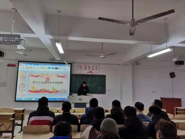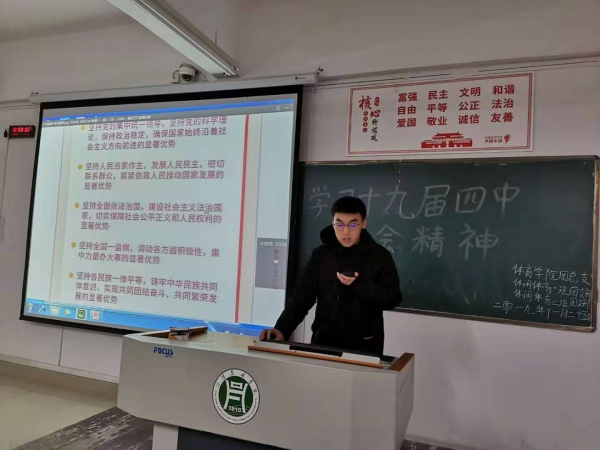 2019年11月25日,体育学院2019级休闲体育专业全体学生在二教209举办了以“学习十九届四中全会精神”为主题的团日活动。