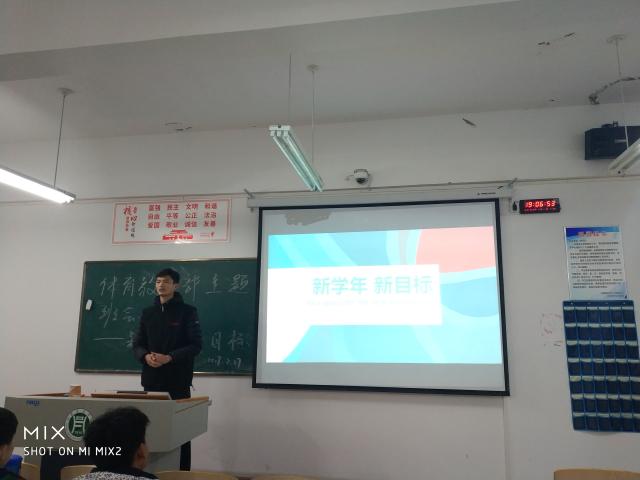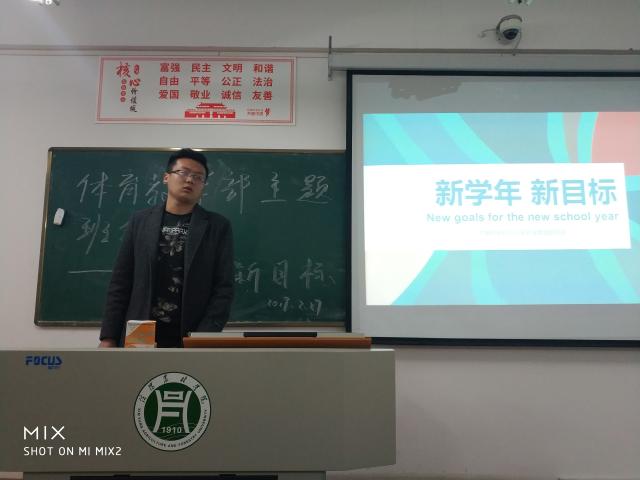2019年2月27日晚18:50—20:30,体育教学部由辅导员彭浩以及29位同学于二教212B 进行了以“新学期、新目标”为主题的班会。首先,由班长对上半学期班级管理工作进行了汇报,总结经验改正不足,并对下半年班级日常管理工作进行了汇总。会上,每位同学都树立了自己新学期的目标并积极发言。最后由辅导员彭浩对上半年的工作进行了总结,并对新学期的班风班纪建设提出了更加严格的要求,希望同学们在新的学期中加强自身专业学科学习、统一思想,统一认识;班干部要以身作则,强化常规管理、重申遵纪守法的重要性。