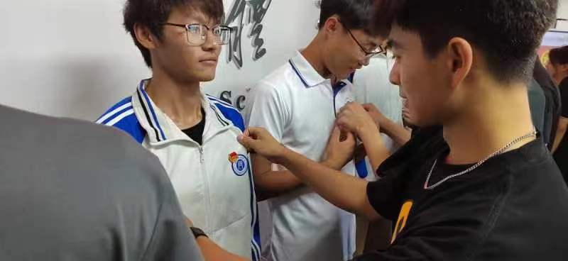 武文静宣读新发展团员名单,老团员为新团员佩戴团徽。