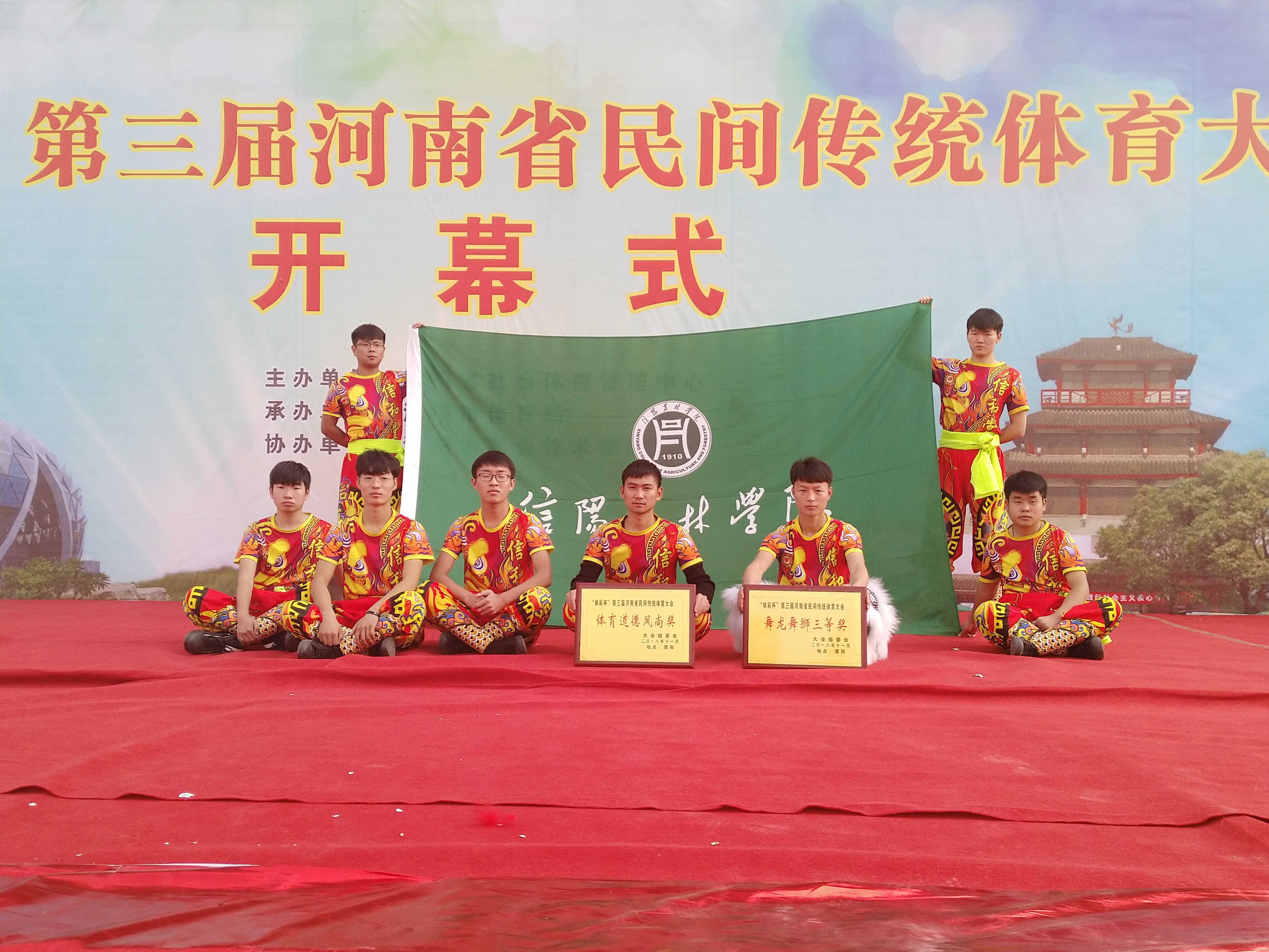 本次参赛是在学校领导大力支持和信阳市体育局充分信任下参加的。体育教学部接到体育局任务后,安排专人负责,精心组织,认真指导,做好参赛各项准备,积极参赛。在比赛中,beat365在线平台官网舞狮队发挥了较高的竞技水平和体育道德风尚,经过激烈角逐获得南狮传统项目三等奖的成绩。同时,经参赛代表队投票,组委会审核授予beat365在线平台官网代表队“体育道德风尚奖”荣誉称号。
