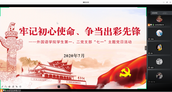 学生第一、二党支部通过线上主题党日活动的形式开展。全体学生党员通过重温入党誓词、学习“红船精神”和《习近平给复旦大学青年师生党员回信》精神、学生党员代表朗诵诗歌为党的99岁生日献礼。作为新时代大学生要深入学习习近平新时代中国特色社会主义思想和党的十九大精神,从党领导人民奋斗的历史和当下中国发展的实践中汲取营养,学思践悟,奋发有为,做新时代的青年奋斗者和圆梦人。