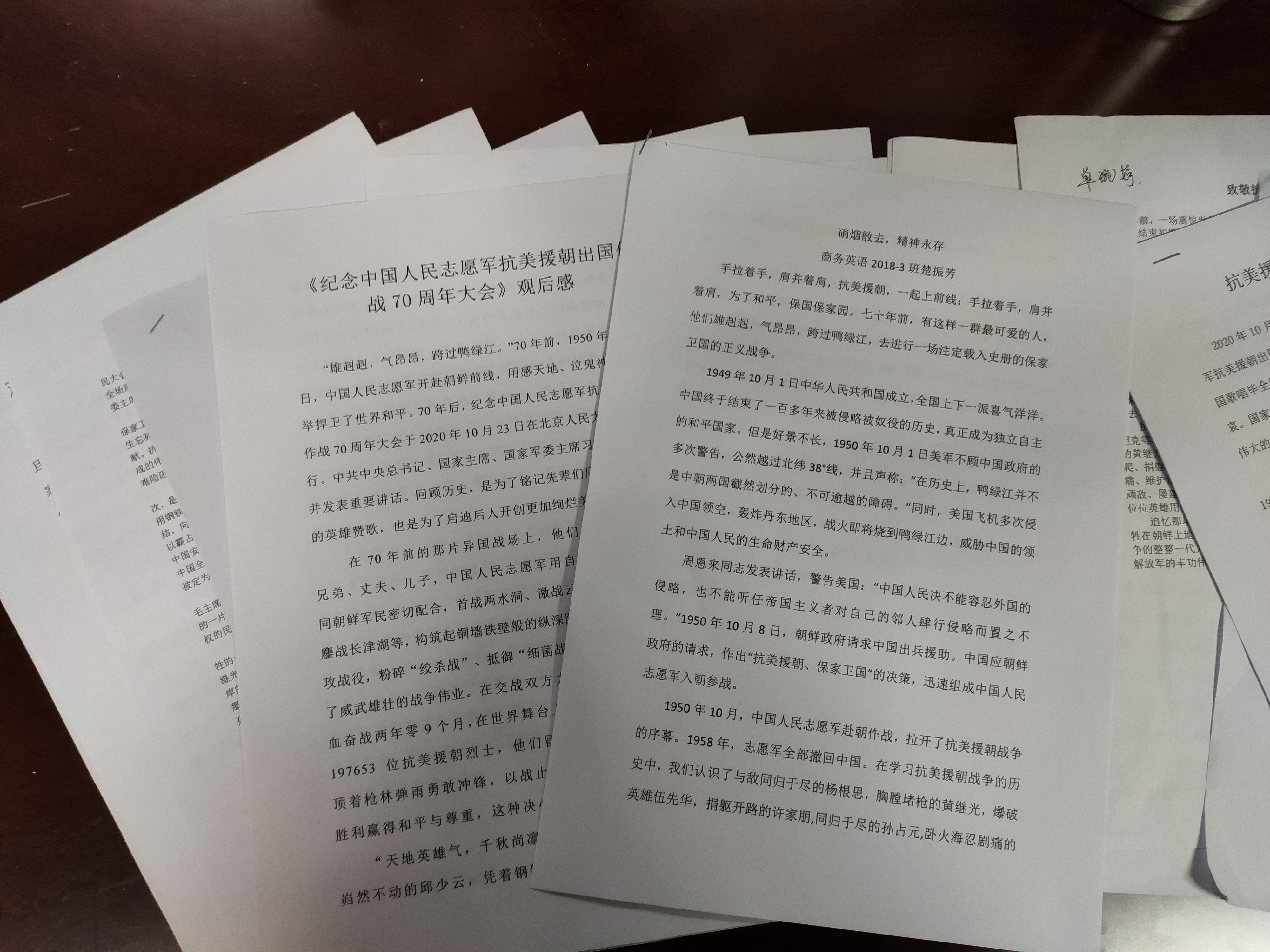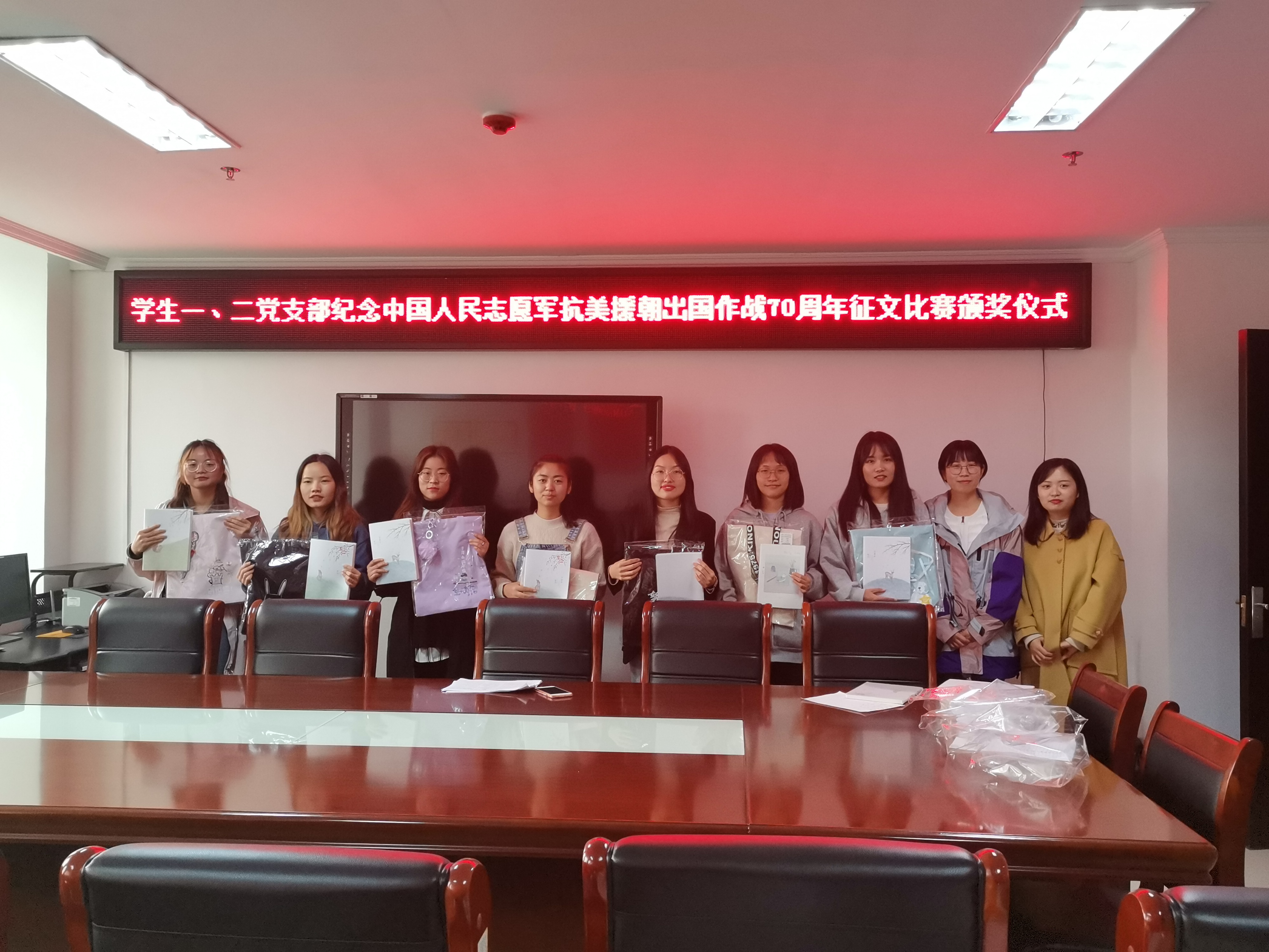 为纪念中国人民志愿军抗美援朝出国作战70周年,继承和弘扬抗美援朝精神,进一步激发我院学生党员的爱国情怀,增强其历史责任感和使命感。11月3日,外国语学院学生第一、二党支部于行政楼803会议室开展“纪念中国人民志愿军抗美援朝出国作战70周年”学习教育会暨主题征文比赛颁奖仪式活动,学生党支部书记范琼琼、朱俊梵及全体学生党员参加。