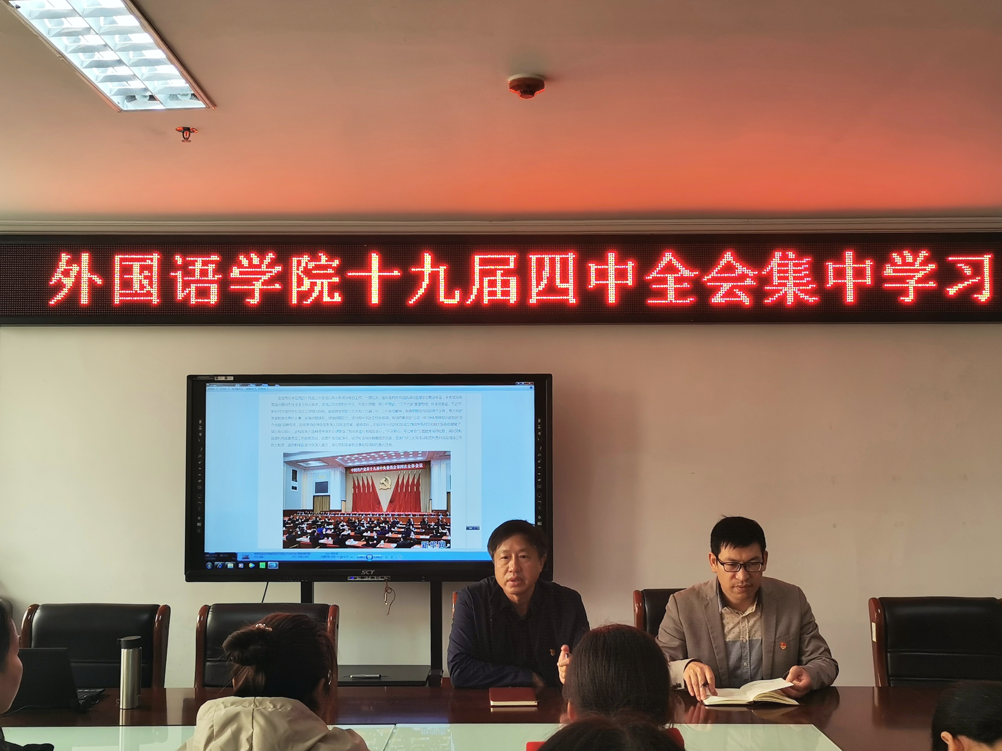 为深入学习贯彻十九届四中全会会议精神,11月6日上午,外国语学院于院办803召开学习党的十九届四中全会精神专题学习会,会议由我院党总支书记张志强主持,院党总支副书记吴宏及部分教工党员和学生党员参加了学习会。