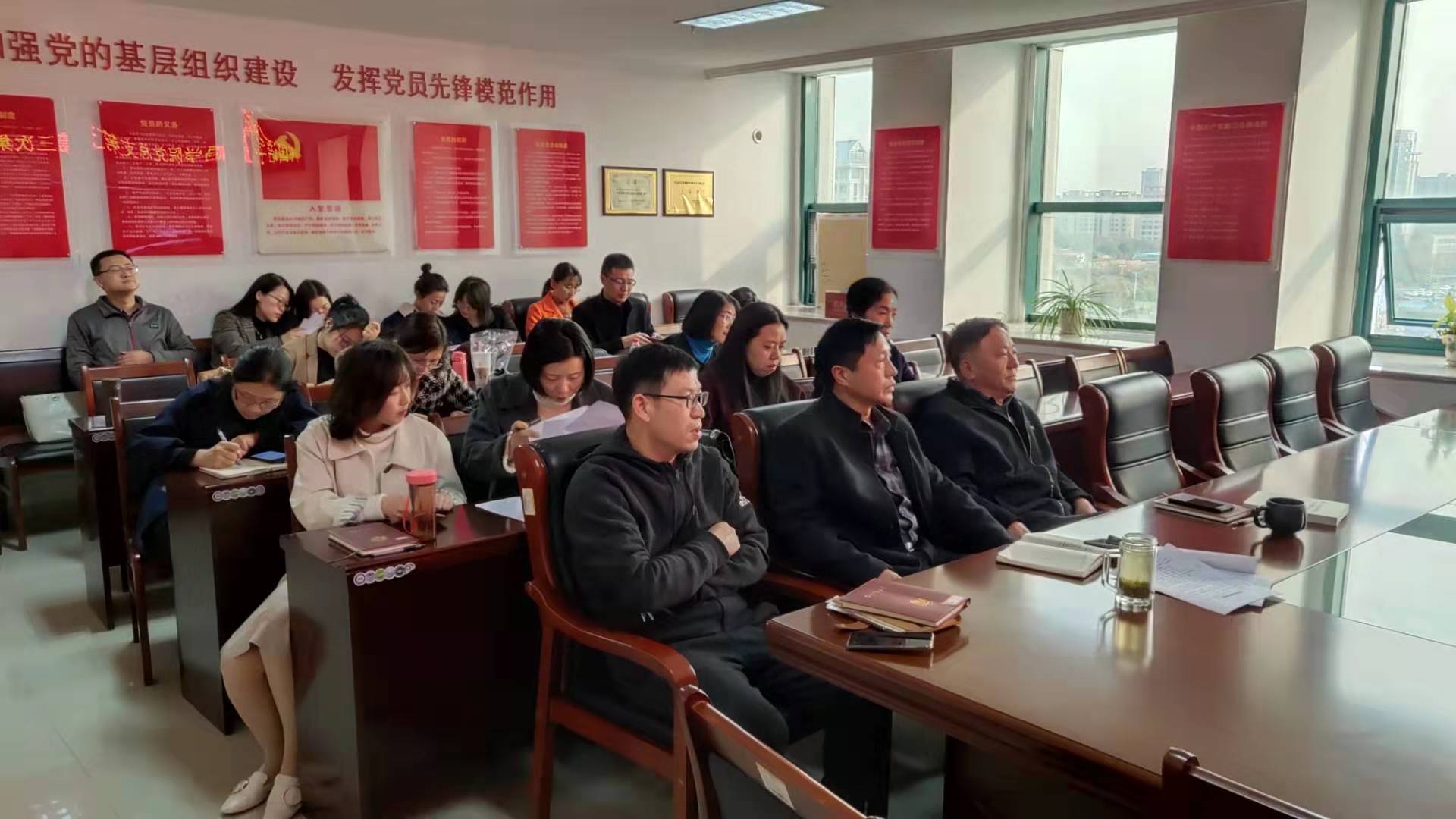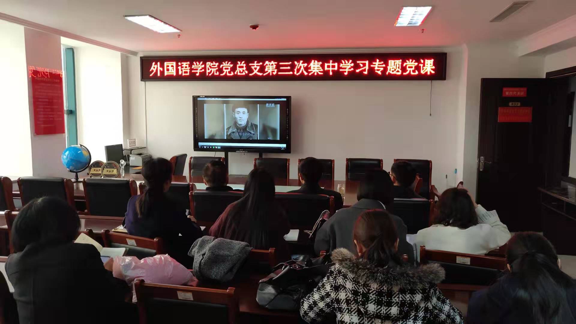 2019年11月23日,外国语学院党总支书记张志强在行政楼803为全体教师党员集体上党课《改天换地70载风华正茂再出发》。