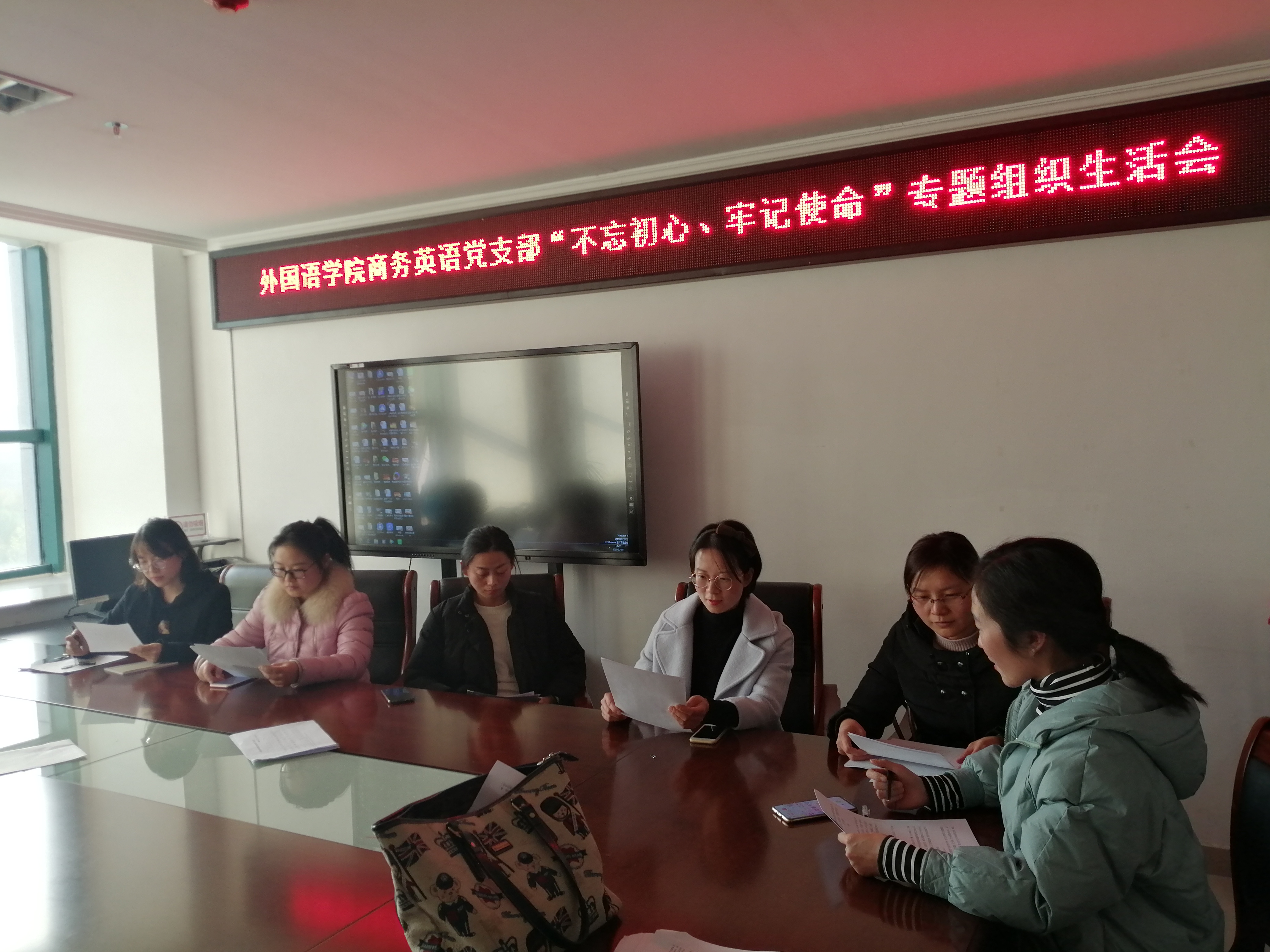 为深入学习贯彻习近平新时代中国特色社会主义思想和党的十九大精神,进一步增强广大党员政治意识、大局意识、核心意识、看齐意识,推动“不忘初心、牢记使命”主题教育入实入深,12月3日,外国语学院党总支在院办803召开基层党支部党员大会,会议由院党总支书记张志强主持,院长滕海、党总支副书记吴宏、副院长蔡鸣、冯昱及全体教工党员参加了本次会议。