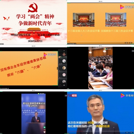 为深入学习贯彻习近平新时代中国特色社会主义思想和2020年全国两会精神,不断提高我院学生党员的思想政治水平,坚定理想信念,6月7日晚,外国语学院学生第一、二党支部通过腾讯会议平台召开“学习‘两会’精神,争做新时代青年”线上主题党日活动,活动由党支部书记朱俊梵主持,全体党员参加。