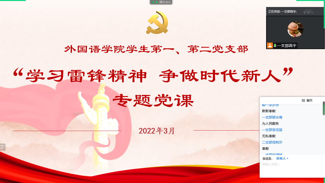 2022327日上午,外国语学院学生第一、第二党支部利用腾讯会议上了学习雷锋精神 争做时代新人专题党课。党课由外国语学院学生第一党支部书记高宇主讲,学生第二党支部书记赵瑞及学生支部全体党员参加。