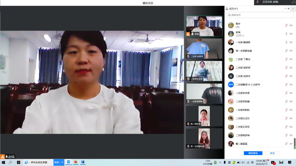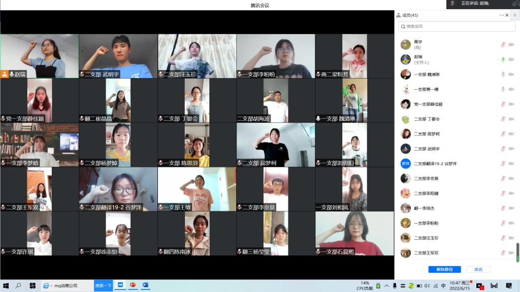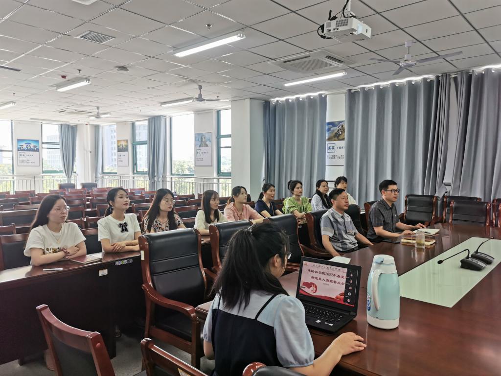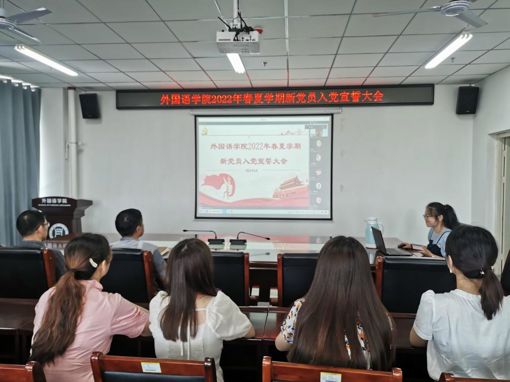为加强新党员的党性教育,激励他们践行入党初心,外国语学院党总支于2022年6月15日上午10点在文学艺术楼402会议室举办了外国语学院2022年春夏学期新党员入党宣誓大会。本次入党宣誓大会采用线上线下同步的方式进行,外国语学院党总支书记张志强、党总支副书记吴宏、商务英语教工党支部书记嵇丽娜、公共英语教工党支部书记张录平、翻译教工党支部书记王珺玥,以及26名学生预备党员和部分入党积极分子学生代表参加了此次大会。各教工支部支委委员、外国语学院学生第一党支部书记高宇和部分教师党员列席了大会。会议由学生第二党支部书记赵瑞老师主持。