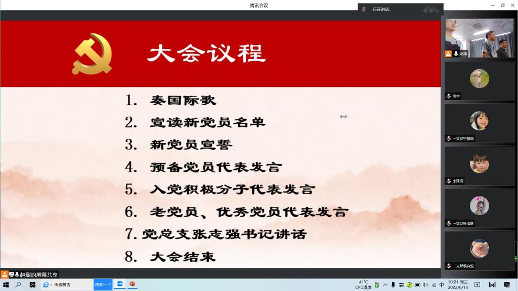 首先,入党宣誓大会在雄壮的《国际歌》声中正式开始。随后,党总支副书记吴宏宣读了此次新党员的名单,并对加入党组织的新党员表示了祝贺;26名新党员在领誓人的带领下,面向党旗进行宣誓。每名党员都用发自内心的声音抒发对党忠诚的决心,面对党旗,短短八十个字的誓词是他们入党后对党的第一个承诺。宣誓结束后,商务英语19级4班的朱文彦同志作为新党员代表进行了发言,表示将把入党誓词铭记终身,时刻牢记党的宗旨,以党员标准要求自己,在学习、生活和工作中践行党员义务与责任。商务英语20级3班的刘思雨同志作为入党积极分子代表进行了发言,表示要向优秀党员同志学习,争取早日成为一名合格党员。然后,商务英语教工党支部书记嵇丽娜老师作为老党员代表进行了发言,结合自身经历,讲述入党故事,同时给予新党员们谆谆教导,劝诫党员同志们需严格要求自己,勿忘入党初心。