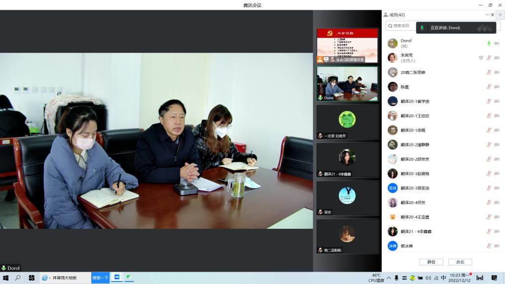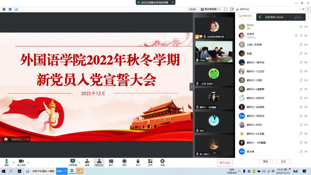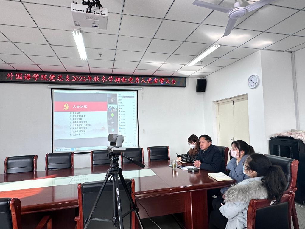 为加强新党员的党性教育,激励他们践行入党初心,外国语学院党总支于2022年12月12日上午10点在文学艺术楼402会议室举办了外国语学院2022年秋冬学期新党员入党宣誓大会。本次入党宣誓大会采用线上线下同步的方式进行,外国语学院党总支书记张志强、副书记吴宏、商务英语教工党支部书记嵇丽娜、学生第一党支部书记高宇、学生第二党支部书记赵瑞,以及28名预备党员参加了此次大会。各教工支部支委委员和教师党员及部分入党积极分子列席了大会。会议由组织员朱俊梵主持。