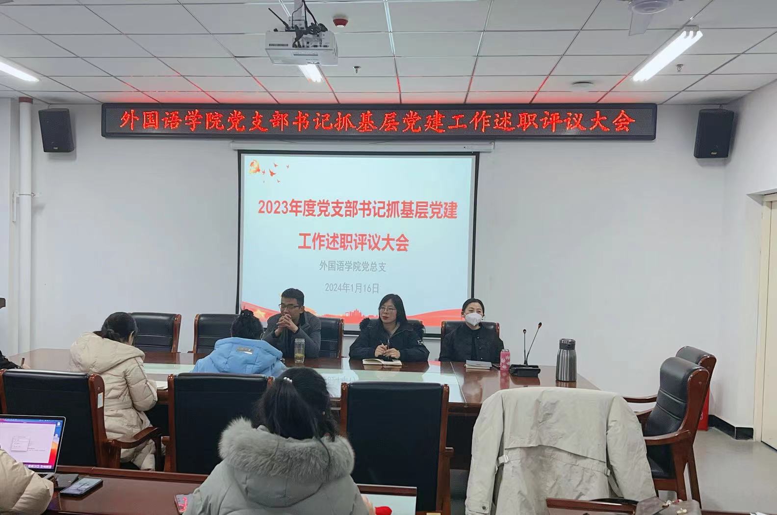 2024年1月16日下午,外国语学院党总支在文学艺术中心402室召开外国语学院2023年度党支部书记抓基层党建工作述职评议大会。党总支书记蔡志、宣传委员芦晓莉、统战委员及青年委员蔡鸣、各支部书记及委员参加了此次大会。