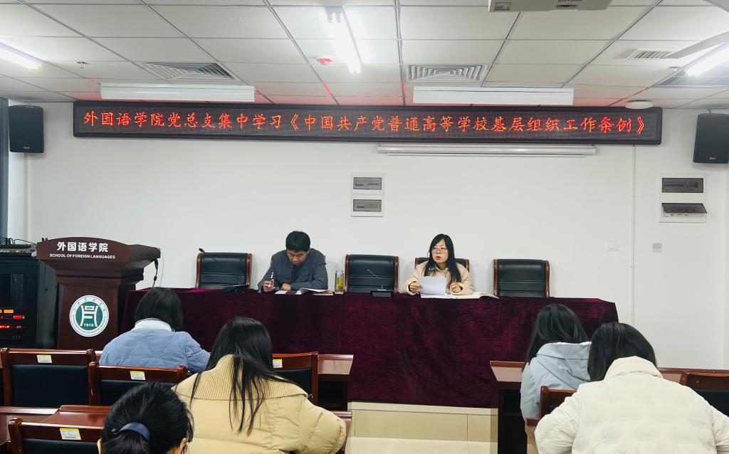 2024年12月10日上午,外国语学院党总支组织全体党员干部在3B实验楼205会议室集中学习了《中国共产党普通高等学校基层组织工作条例》(以下简称《条例》),会议由党总支书记蔡志主持。