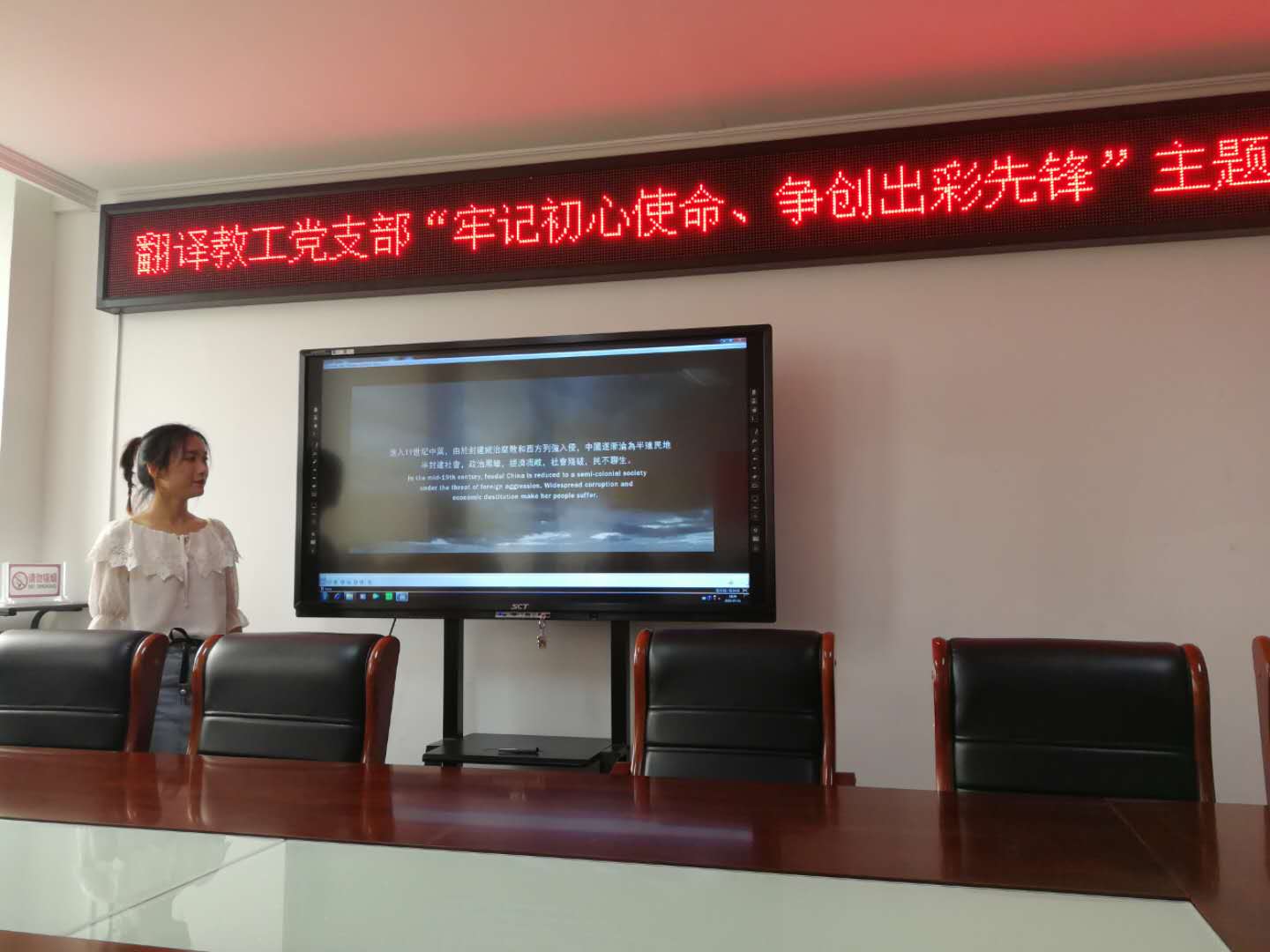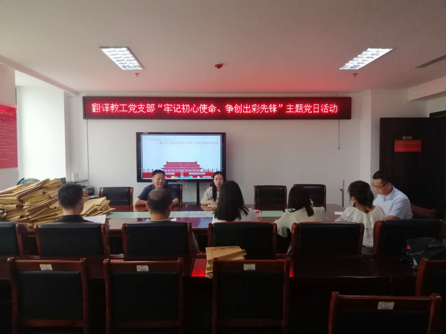为庆祝我党成立99周年,7月1日下午三点,外国语学院翻译教工党支部在行政楼803开展以“牢记初心使命,争当出彩先锋”为题的迎“七一”主题党日活动,支部党员全体参加,会议由支部书记王珺玥主持。