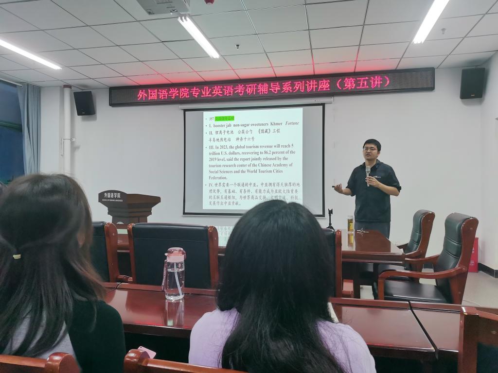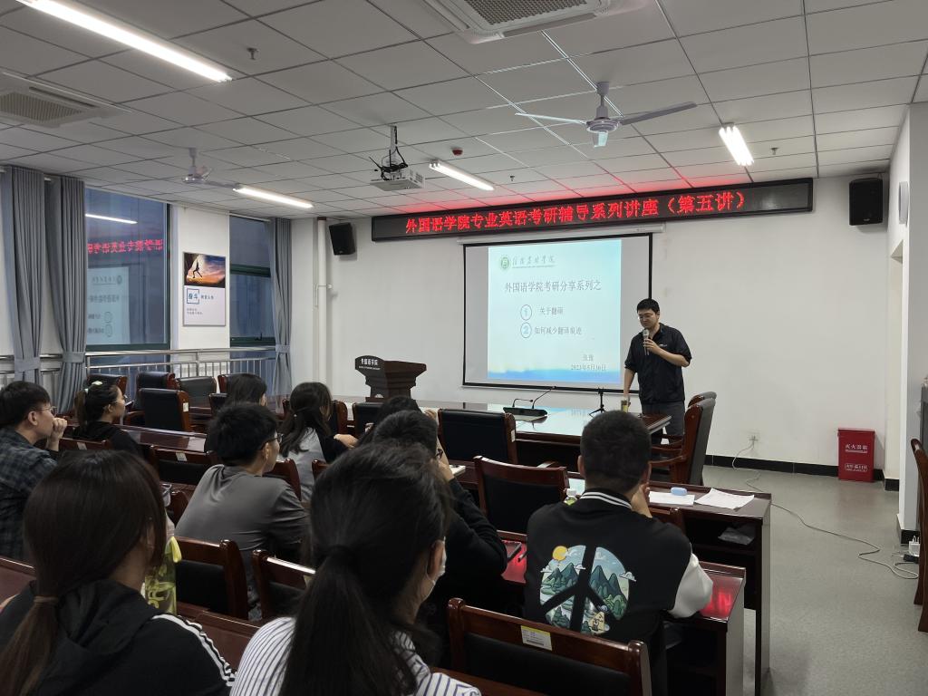202353019点,外国语学院在文学艺术楼402举办了专业英语考研辅导系列讲座第翻译硕士考研指导讲座。本次讲座由外国语学院专任教师张豫主讲,学院20部分报考翻硕的学生21级部分有意向报考该方向的学生参加了本次讲座。张豫老师从翻硕备考细节和如何减少翻译痕迹两个方面展开,前者主要包括择校注意事项以及《翻译硕士英语》、《英语翻译基础》、《汉语写作与百科知识》这三门课程的题型题量与复习思路;后者结合具体案例,主要阐述变词为句、句式重构和套译法的运用。通过本次讲座,学生进一步了解了翻硕的备考思路,对于如何让译文更地道也有了更深的领悟。