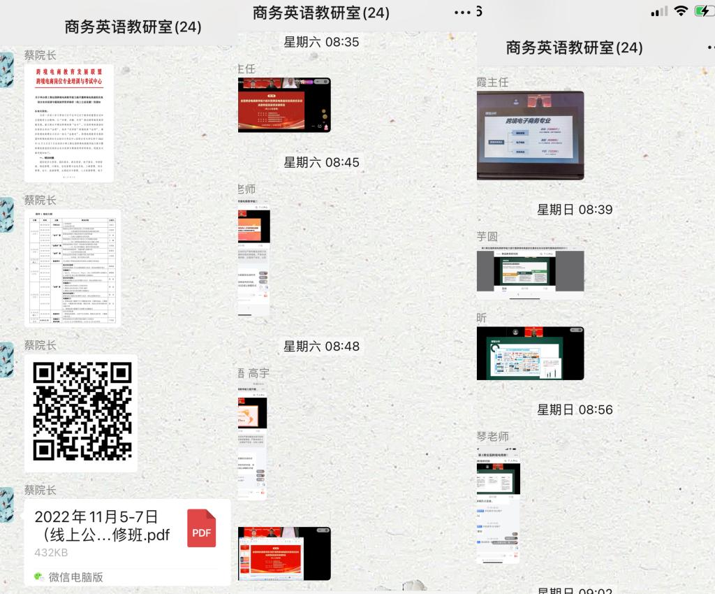 在为期三天的研修班培训中,商务英语教研室全体教师,在云端积极学习跨境电商的基础知识与优秀平台案例,了解跨境电商大数据平台的各个重要板块和功能,并针对当日课程内容在商务英语教研室群内打卡学习,开展复盘研讨,在此过程中将所学所感深化、细化、强化、固化、优化。