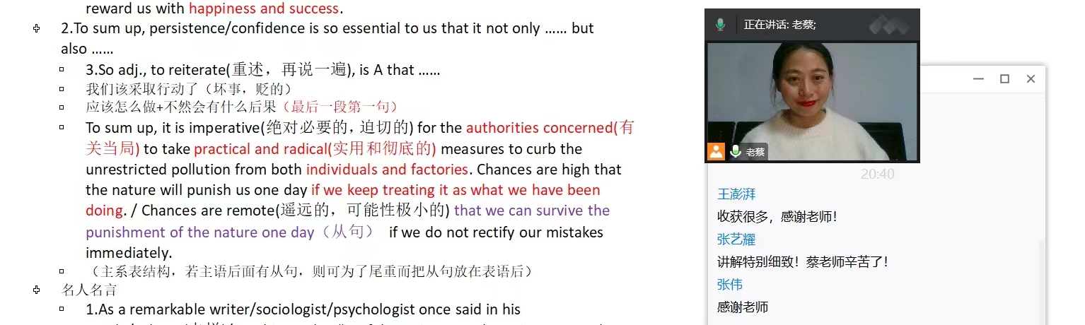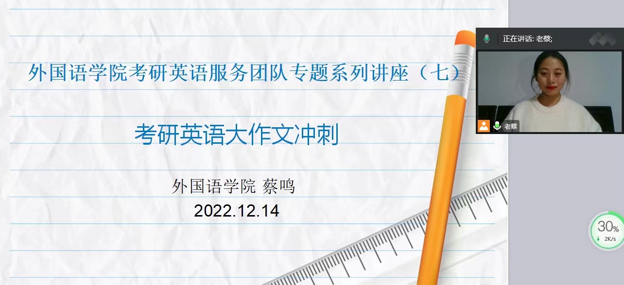 为帮助beat365在线平台官网学生掌握考研英语大作文提分技巧,有效进行考研冲刺,12月14日晚上7:00点,由我院副院长芦晓莉博士组织成立的外国语学院考研英语服务团队通过腾讯会议向beat365在线平台官网本科生开展考研英语专题系列(七)---考研英语大作文冲刺讲座。此次讲座由蔡鸣老师主讲。