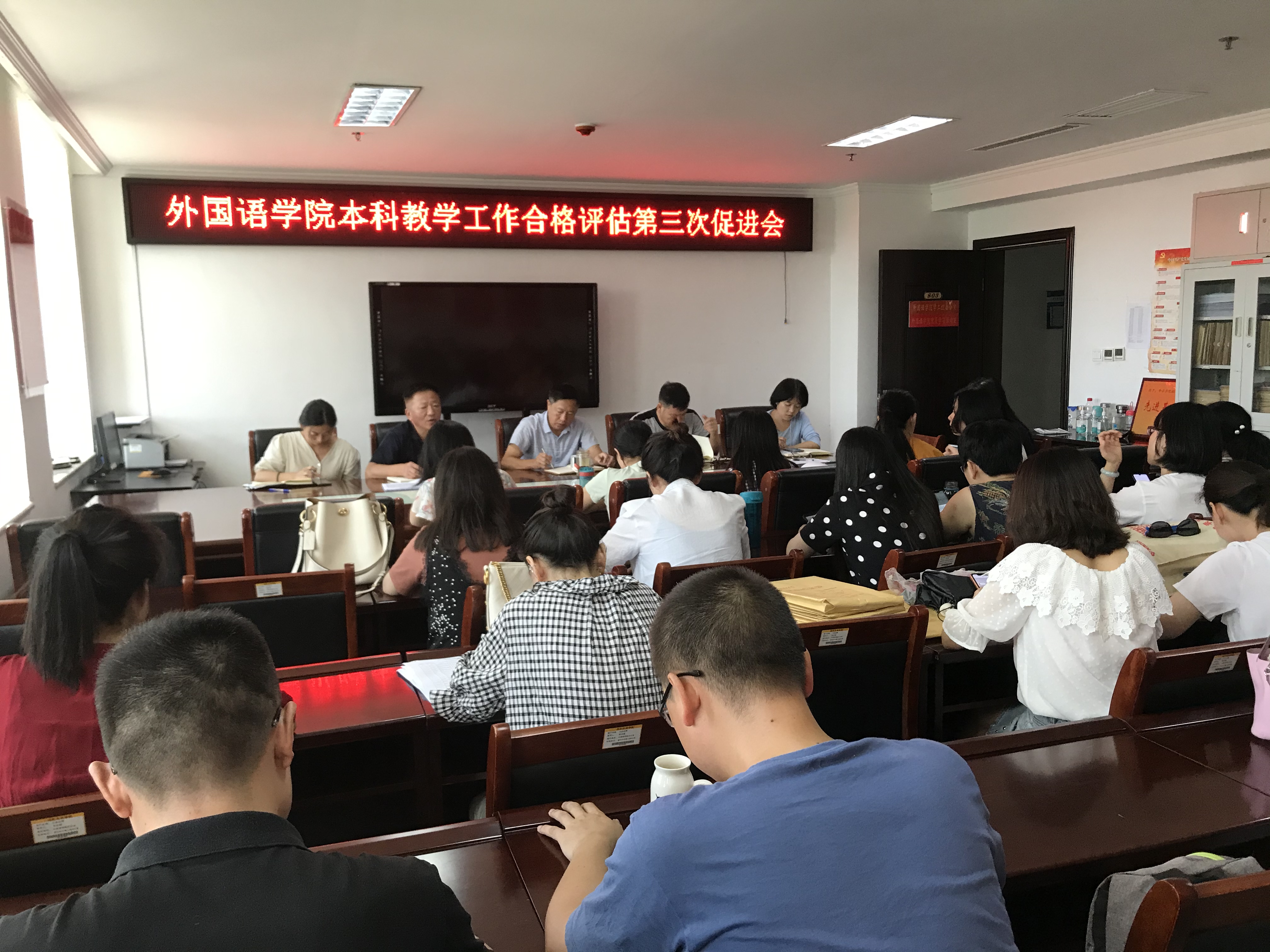 8月14日,外国语学院召开本科教学工作合格评估第三次促进会,外国语学院全体教师参加,会议由滕海院长主持。