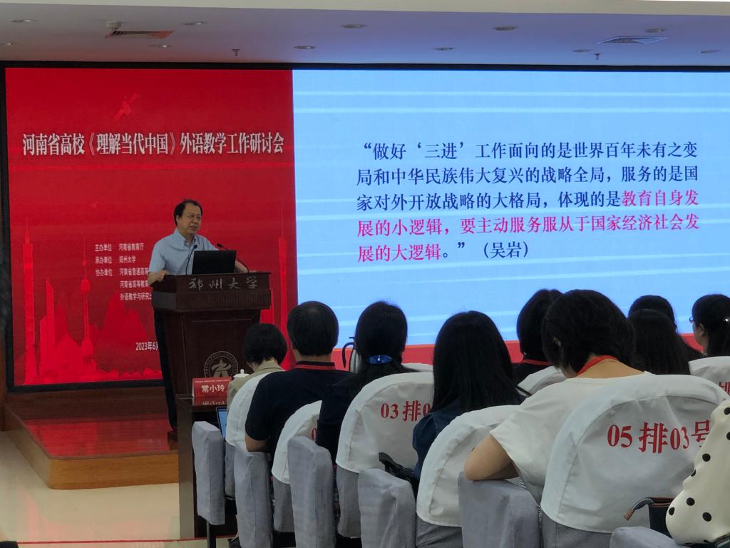 会议伊始,河南省教育厅高等教育处张水潮处长、郑州大学副校长张倩红以及外研社党委副书记兼副总编辑常小玲分别进行了会议开幕式致辞,本次研讨会由此拉开序幕。首先,北京外国语大学副校长孙有中教授就“三位一体推进‘三进’工作、课程思政和新文科建设”为议题进行了报告。孙教授指出,中国高等外语教育不仅要继续把世界介绍给中国,而且更为紧迫的是,把中国介绍给世界。外语教育只有与时俱进,方能回应时代之需。他分析了新文科建设、课程思政与“三进”工作的关系,指出这三者在外语类专业的共同目标就是:理解中国,沟通世界。同时,孙教授介绍了“理解当代中国”系列教材的编写理念,强调了该系列教材的教学重点为深刻领会习近平新时代中国特色社会主义思想,将《习近平谈治国理政》多语种版本“进高校、进教材、进课堂”落到实处。随后,电子科技大学外国语学院院长胡杰辉教授以“《理解当代中国》在大学外语教学中的有机融入”为议题进行了报告。胡教授梳理了新时代大学外语教学系统观,介绍了如何将高等学校“理解当代中国”系列教材有机融入大学外语教学,以此帮助学生了解中国话语体系,用中国理论讲好中国实践的经验探索。在院校交流环节,郑州大学、河南大学及河南师范大学等三所高校代表分别围绕《理解当代中国》系列教材的使用和教学实践进行了分享交流。