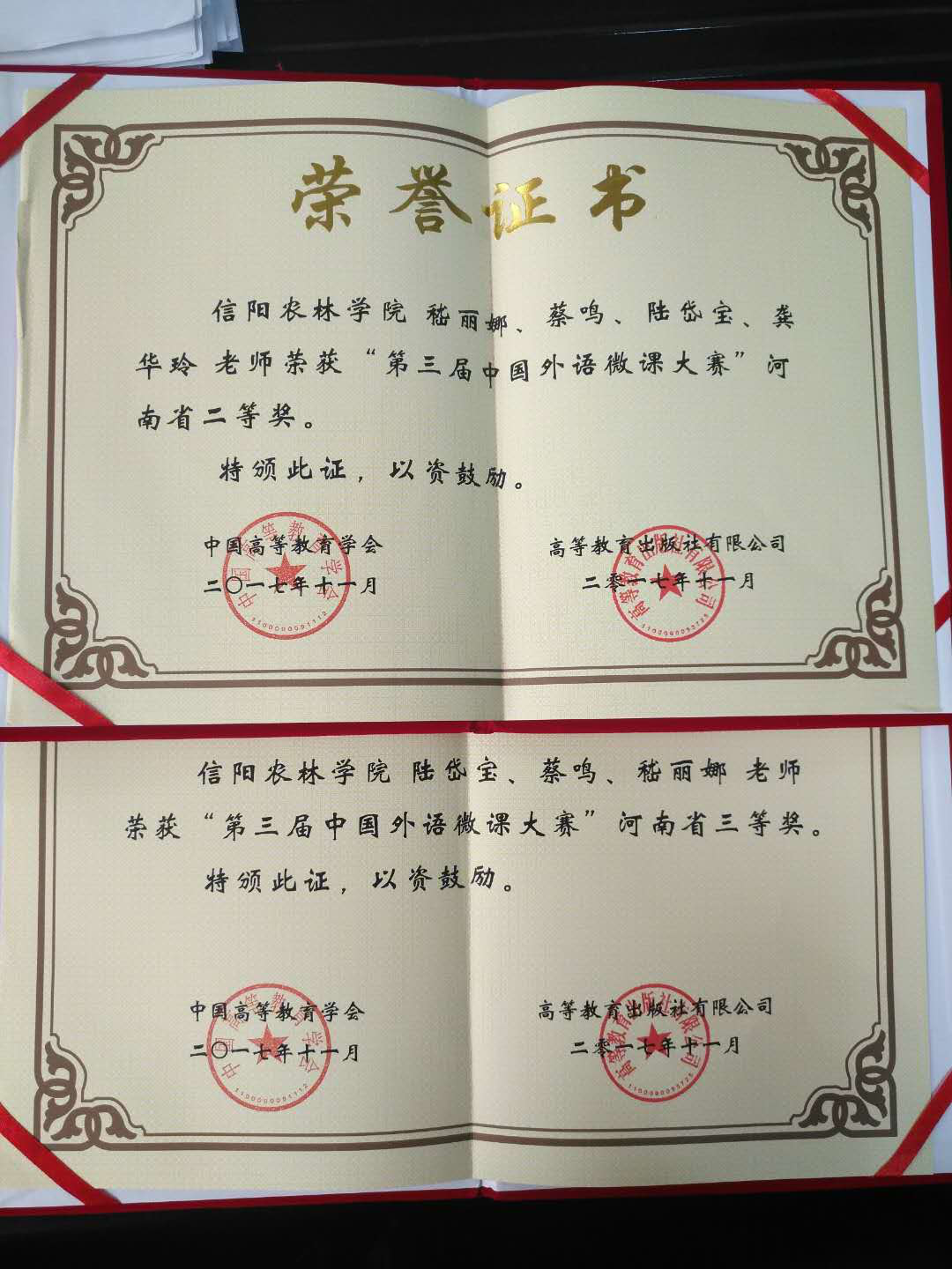 我院教师嵇丽娜及其所在团队荣获 “第三届中国外语微课大赛” 本科英语组河南省二等奖,陆岱宝及其所在团队荣获 “第三届中国外语微课大赛”高职高专英语组河南省三等奖。