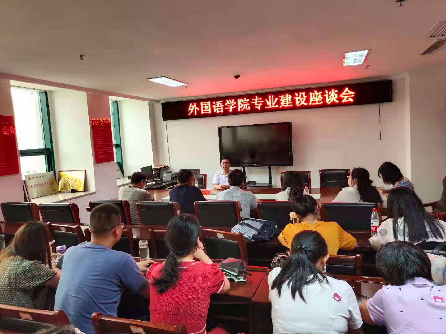 为进一步加强专业建设、促进学院内涵发展,2021年6月29日下午4点半,外国语学院在行政楼803会议室召开专业建设座谈会。本次座谈会特邀曲阜师范大学翻译学院院长卢卫中教授莅临指导,学院班子成员、商务英语、翻译和大学英语教研室代表老师出席座谈会,座谈会由院长滕海主持。