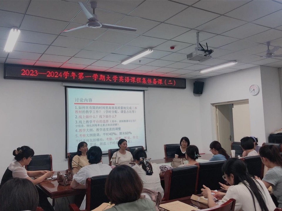 为提高课堂教学质量,进一步落实立德树人的教学要求,9月19日下午4点半,外国语学院公共英语教研室在文学艺术楼402开展2023-2024学年第一学期集体备课的教研活动,教学副院长蔡鸣及全体大学英语任课教师参加此次活动。