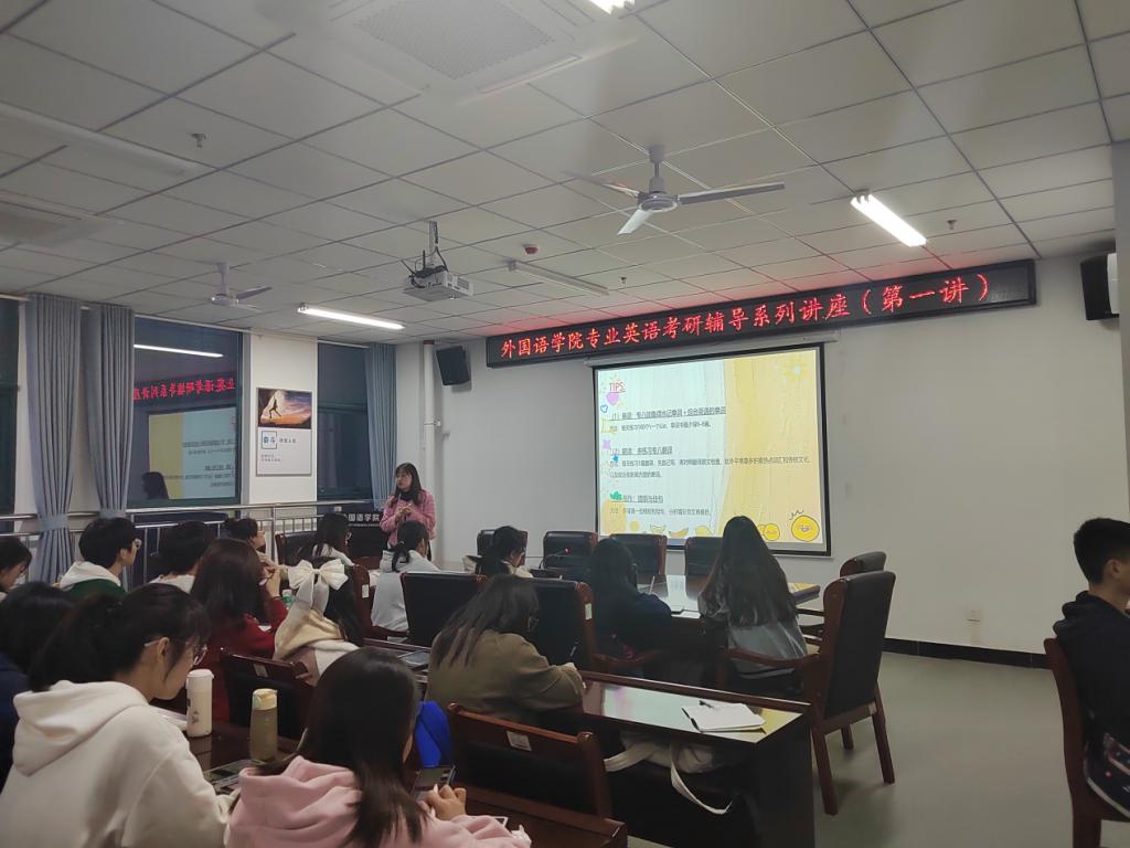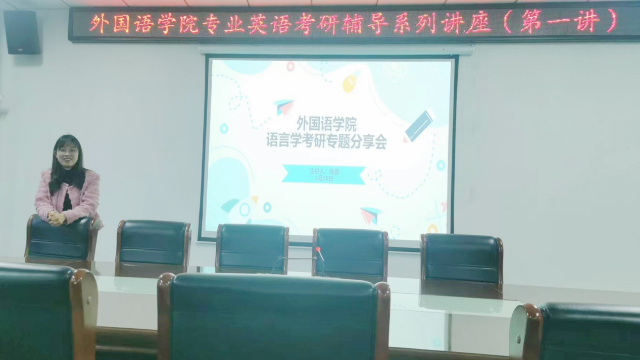 2023年4月25日晚上7:00,外国语学院在文学艺术楼402开展了专业英语考研辅导系列讲座第一讲——语言学专业考研的指导讲座。讲座由陈嘉老师主持,我院20级商务英语专业志愿考研的学生参加了本次讲座。