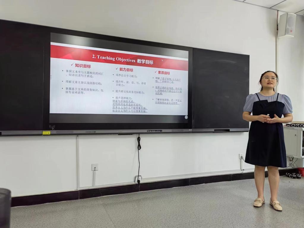 为了响应党的二十大精神、学习贯彻习近平总书记关于教育的重要论述,落实立德树人根本任务助力课程思政建设和新工科、新农科、新文科建设,全面提高教育质量,商务英语教研室在2023年6月6日下午2点在文学艺术楼306举行了课堂教学创新大赛教研室初赛,教研室主任张霞主持本次比赛,青年教师赵瑞、熊瑞、陈嘉参加了此次比赛,副院长蔡鸣及教研室其他教师观摩此次比赛。